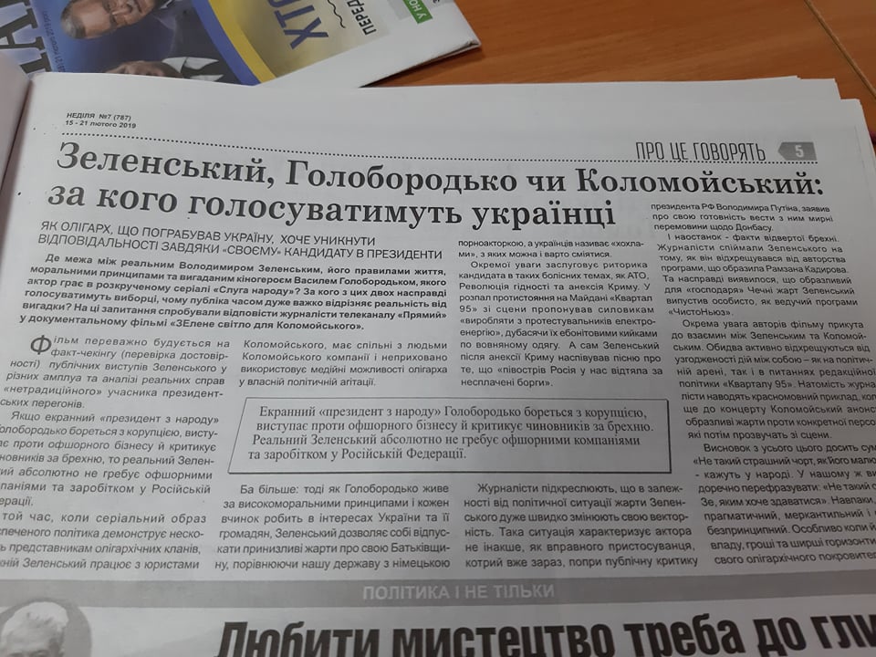 Матеріал із ознаками «чорного піару» на адресу кандидата Володимира Зеленського можна прочитати у випуску газети «Неділя» від 15-21 лютого із заголовком «Зеленський, Голобородько чи Коломойський: за кого голосуватимуть українці». У матеріалі вказують на зв’язок кандидата у Президенти Володимира Зеленського та відомого українського олігарха, політичного діяча Ігоря Коломойського. Протилежну цій думку у матеріалі не висвітлюють.