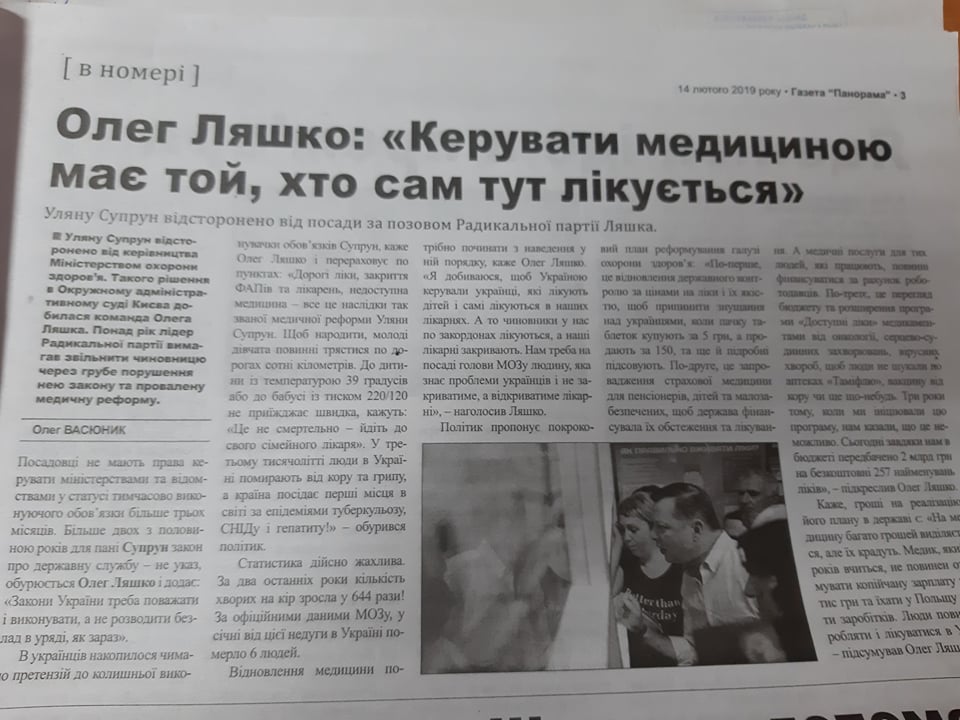 У газеті «Панорама» від 14 лютого є матеріал із заголовком «Олег Ляшко: керувати медициною має той. Хто сам тут лікується». У статті йдеться про те, що команда Олега Ляшка домоглася відсторонення Уляни Супрун від посади. Автор матеріалу запевняє, що Олег Ляшко понад рік вимагав звільнити чиновницю через грубе порушення закону та провалену, на думку народного депутата, медичну реформу. Також у статті подають план дій від Олега Ляшка, який, на його думку, може допомогти у реформуванні медичної галузі.