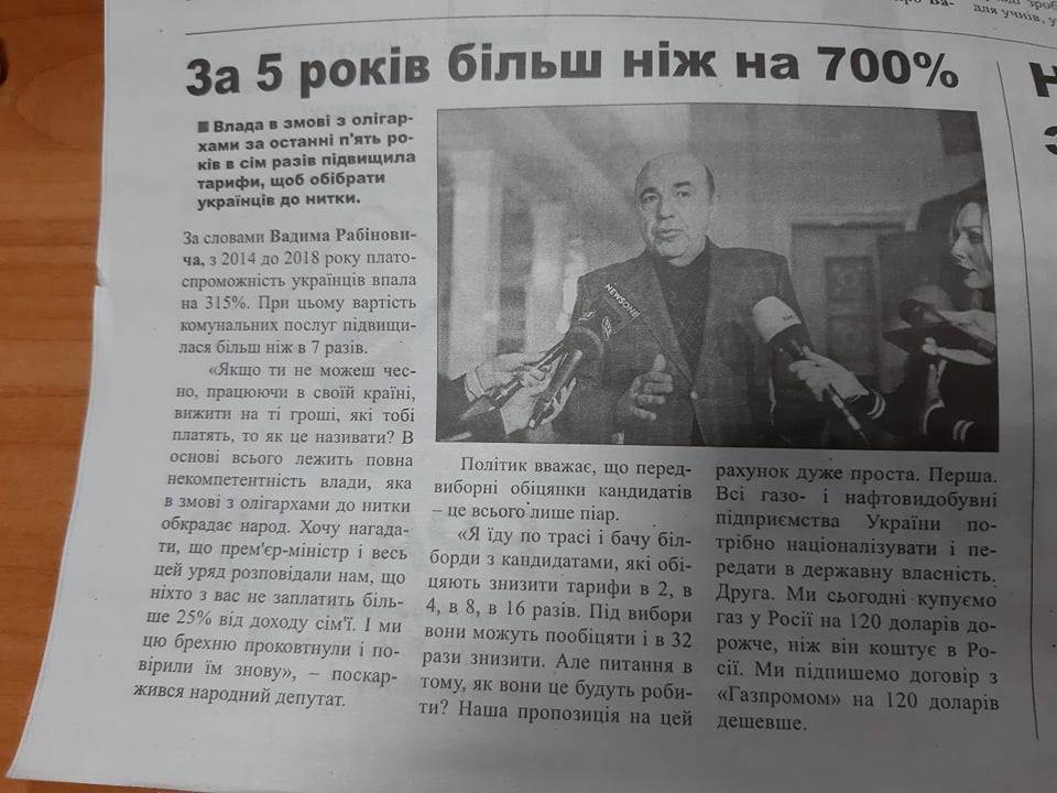Газета «Панорама» у числі від 7 лютого опублікувала статтю «За 5 років більше, ніж на 700%», яка супроводжується фотографією народного депутата Вадима Рабіновича. У тексті йдеться про те, що влада у змові із олігархами за останні 5 років у сім разів підвищила тарифи, щоб обібрати українців до нитки. За словами політика, платоспроможність українців впала на 31,5%. Також у статті вказано, що на думку Рабіновича, усі передвиборчі обіцянки кандидатів – це всього лише піар.