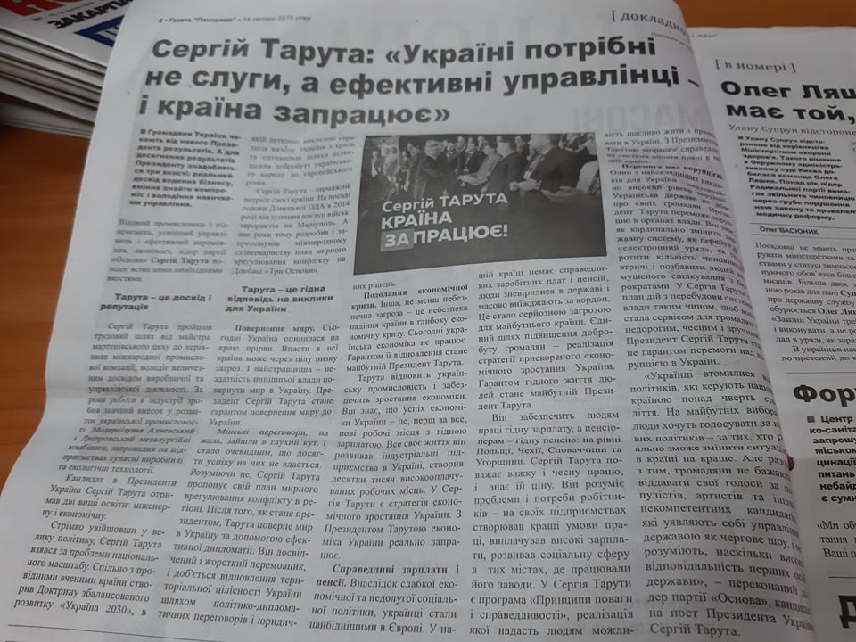 У газеті «Панорама» від 14 лютого опублікували статтю «Сергій Тарута: Україні потрібні не слуги, а ефективні управлінці – і країна запрацює» на користь кандидата на пост Президента Сергія Тарути, яка також промаркована, як політична реклама.