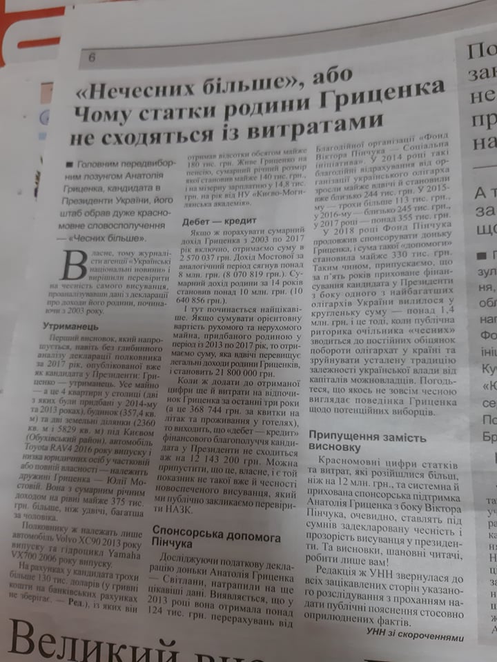 Прикладом «чорного піару» проти Анатолія Гриценка є стаття у газеті «РІО» від 2 лютого із заголовком «Нечесних більше, або чому статки родини Гриценка не сходяться із витратами», у якій автор натякає, що згідно із податковою декларацією політика за 2017 рік, його можна назвати утриманцем, тому що за інформацією, яку наводять у статті, власницею майна Гриценків є його дружина.