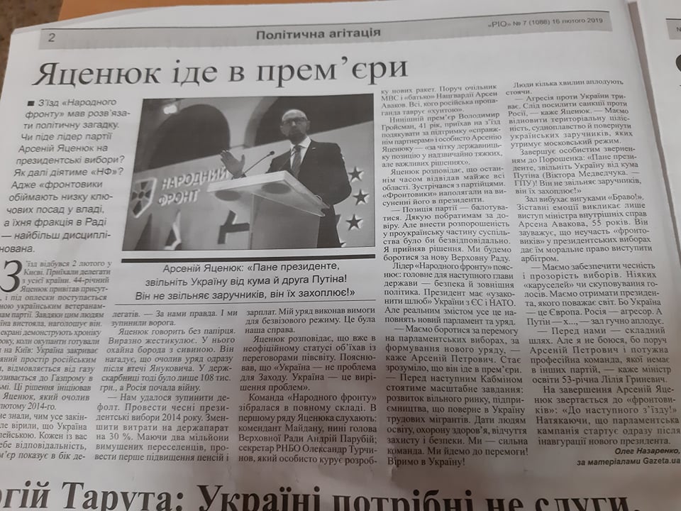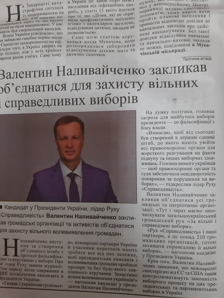Матеріал із заголовком «Валентин Наливайченко закликав об’єднатися для захисту вільних справедливих виборів» опублікували на сторінках газети «РІО» від 16 лютого із позначкою «політична реклама».