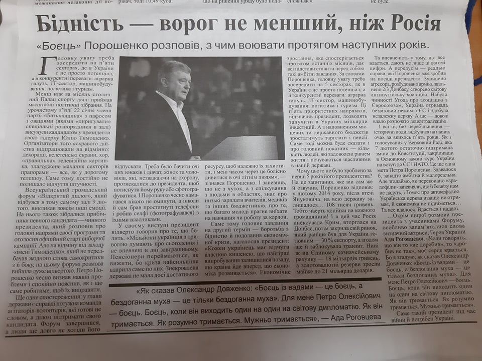У газеті «РІО» від 16 лютого розмістили статтю із назвою «Бідність – ворог не менший, ніж Росія». У цьому тексті є ознаки прихованої політичної реклами. У тексті йдеться про речі, на які Петро Порошенко пропонує звернути увагу у найближчі 5 років задля розвитку країни, наприклад – на розвиток аграрної галузі. Крім цього, у цьому матеріалі також йдеться про з’їзд партії ВО «Батьківщина», на якому, на думку автора матеріалу, панували штучна атмосфера, що не можна сказати про «Всеукраїнський громадський форум «Відкритий діалог», який зібрав прихильників чинного Президента.