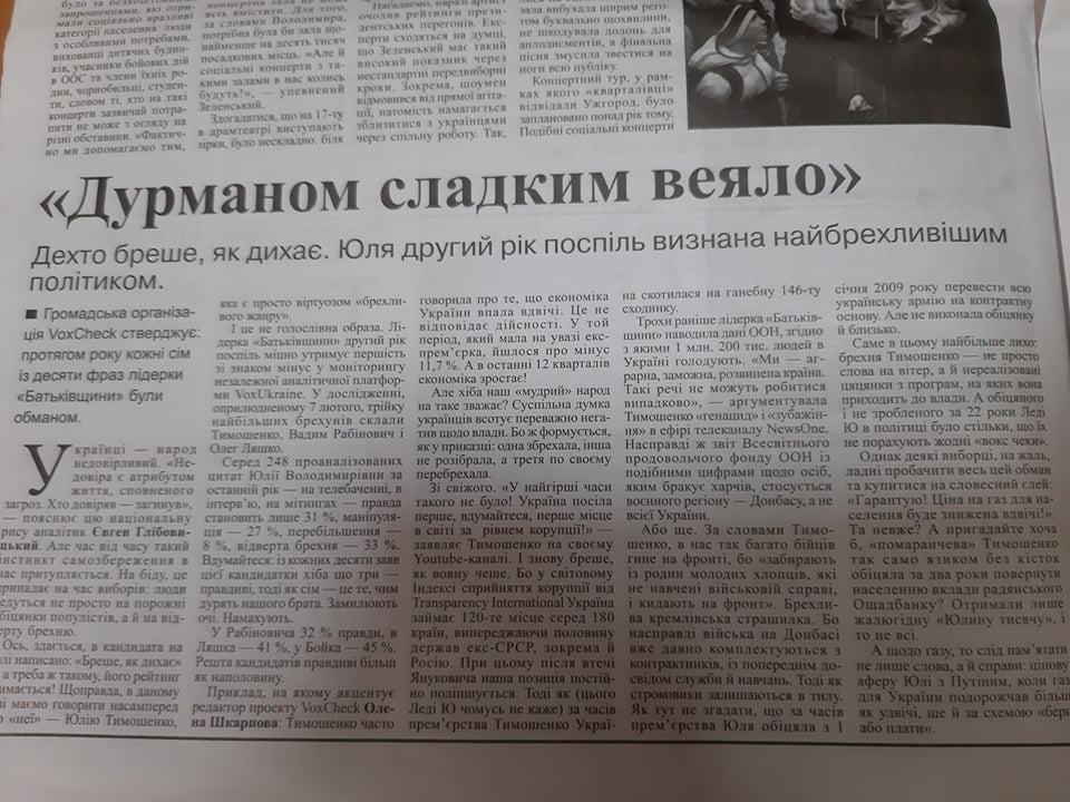 У газеті «РІО» від 16 лютого опублікувала текст із назвою «Дурманом сладким веяло», у якому йдеться про те, що уже другий рік поспіль кандидатку Юлію Тимошенко визнають найбрехливішим політиком. У тексті немає протилежної цій думці, тому інформацію можна вважати однобоко висвітленою.