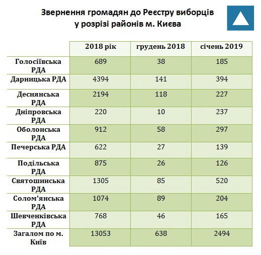 Водночас активно звертаються до Державного реєстру виборців й громадяни, зареєстровані у самому Києві. Про це свідчать дані, які отримала Громадянська мережа ОПОРА. На початку лютого, щоб з’ясувати динаміку звернень киян до Державного реєстру виборців, представники ОПОРИ надіслали офіційні запити до всіх районних державних адміністрацій столиці. В отриманих відповідях містяться дані про кількість звернень за 2018 рік загалом, а також окремо – за грудень 2018-го та січень 2019 року.