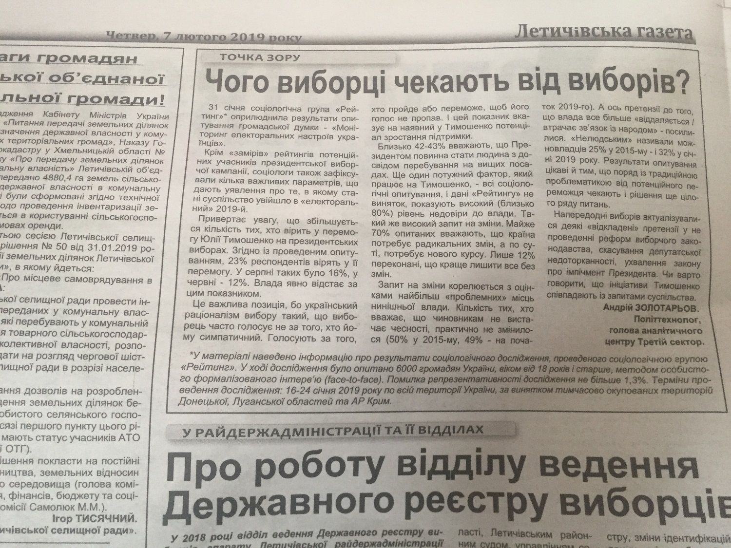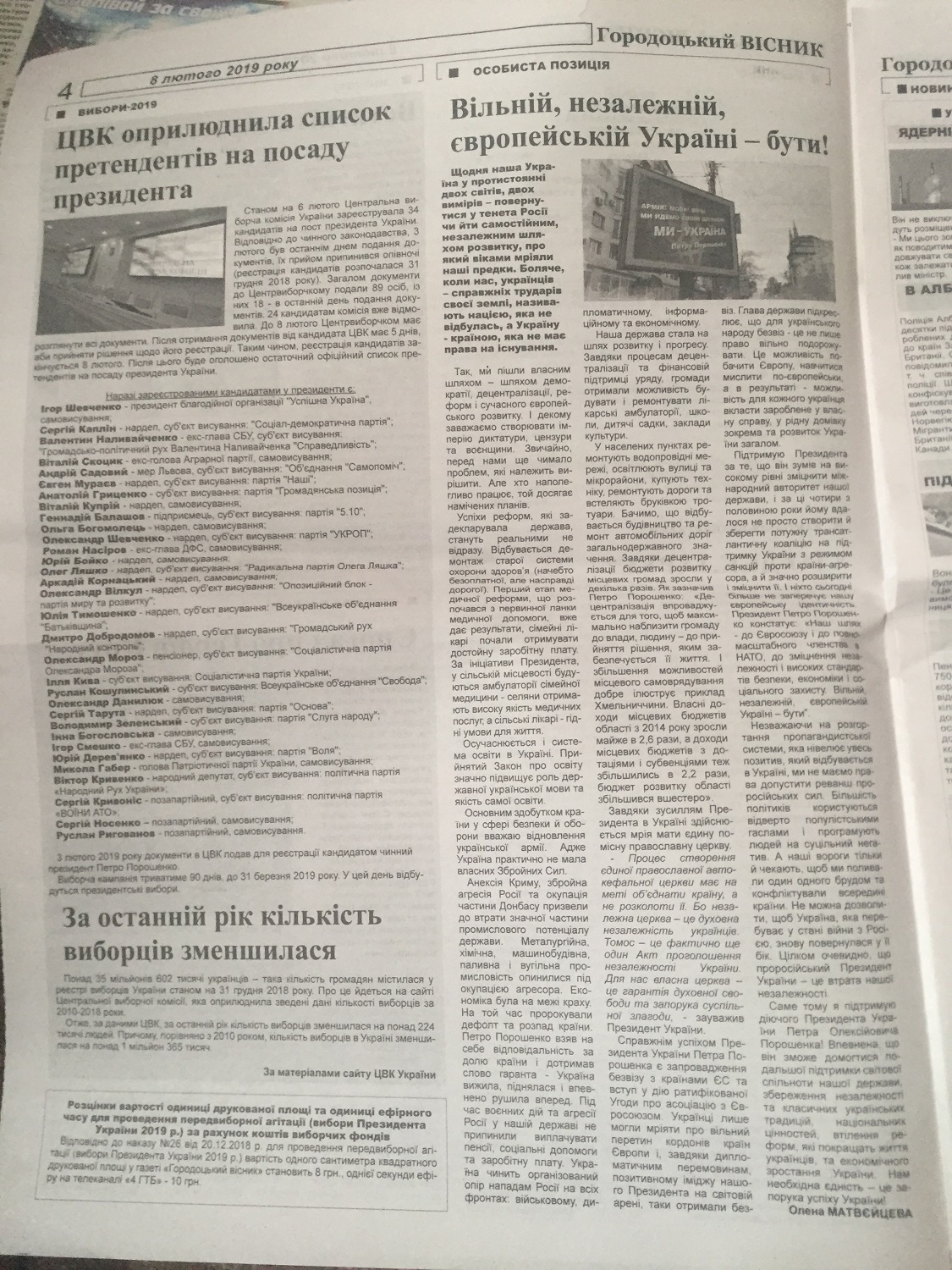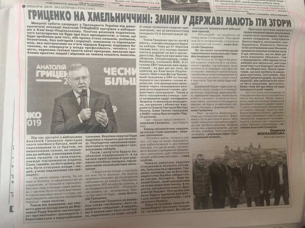 Спостерігачі ОПОРИ проаналізували 114 обласних та районних видань, що вийшли друком у Хмельницькій області в лютому, на наявність прихованої реклами кандидатів, партій, а також на присутність у виданнях виборчої тематики загалом. У підсумку моніторингу було виявлено 89 публікацій з ознаками «джинси» за кандидатів на пост Президента України: по 36 матеріалів на користь Петра Порошенка та Юлії Тимошенко, 8 – Олега Ляшка, 6 – Анатолія Гриценка та по одній публікації з ознаками прихованої реклами Руслана Кошулинського, Валентина Наливайченка та Володимира Зеленського. Натомість у січні в районних та обласних газетах Хмельниччини ОПОРА зафіксувала 74 матеріали з ознаками замовності на користь тоді ще потенційних кандидатів.