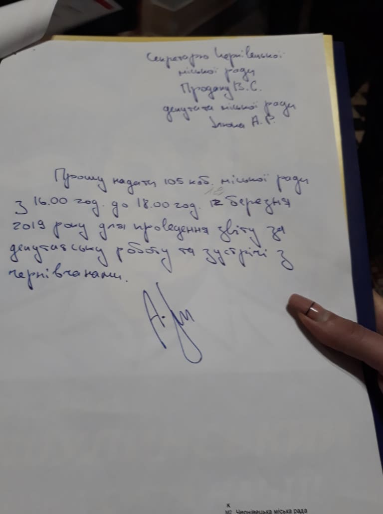 Як вдалося дізнатись пізніше, залу для проведення заходу було надано на запит депутата від ВО «Свобода» Андрія Ілюка, в якій він зазначає, що йому потрібна аудиторія для «проведення звіту за депутатську роботу та зустрічі з чернівчанами».