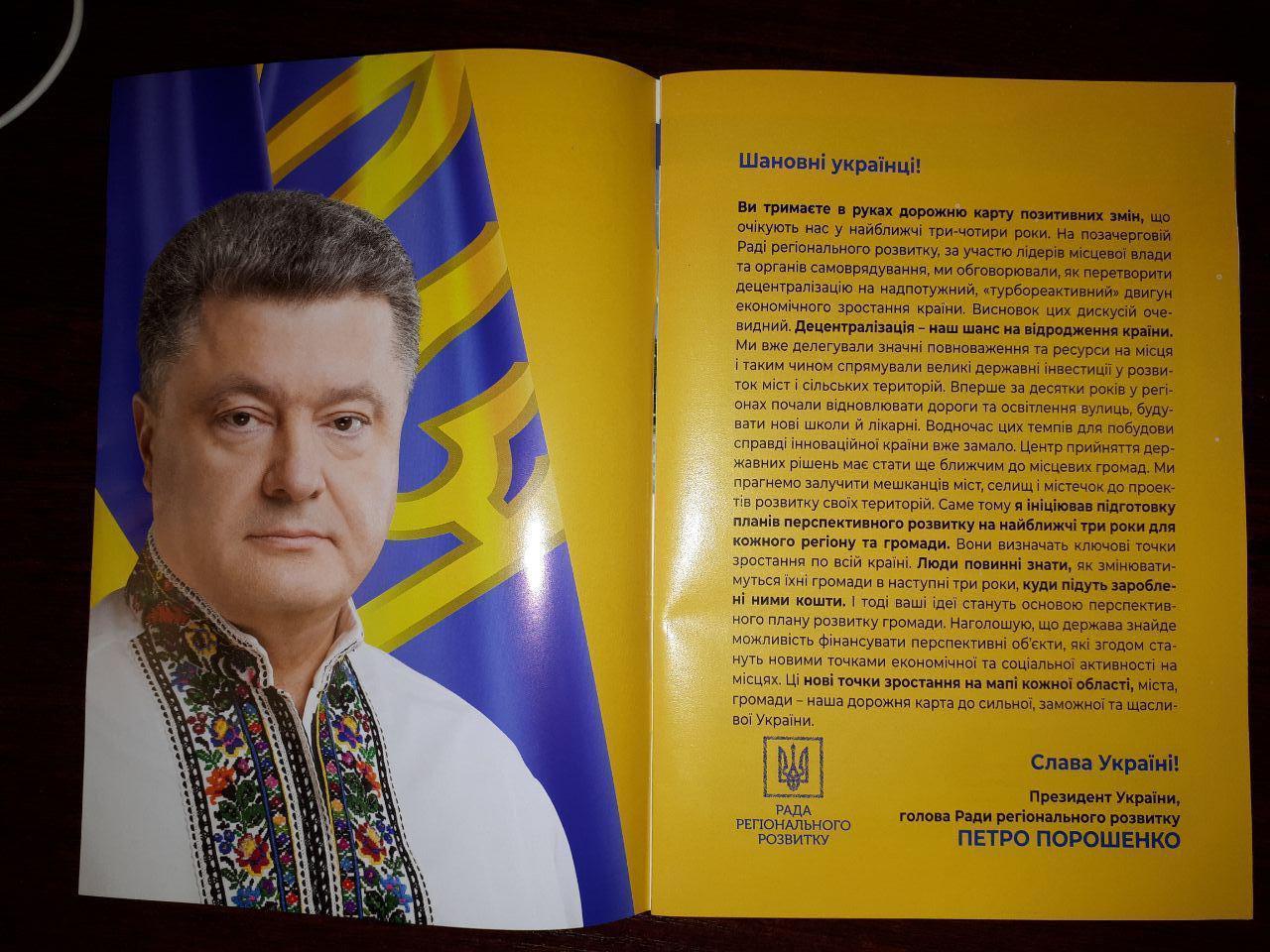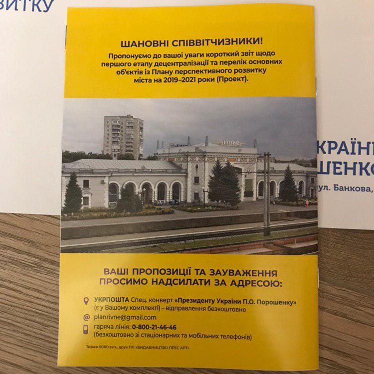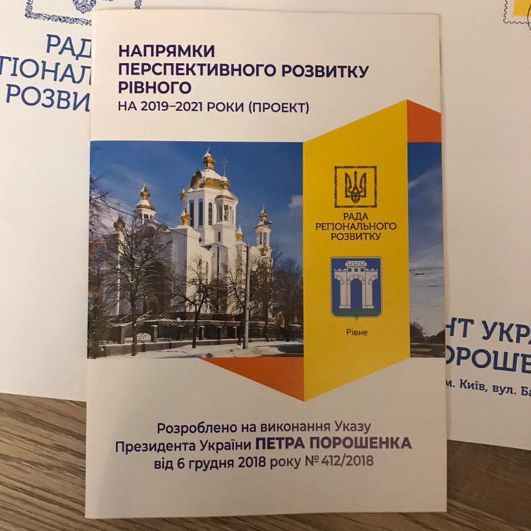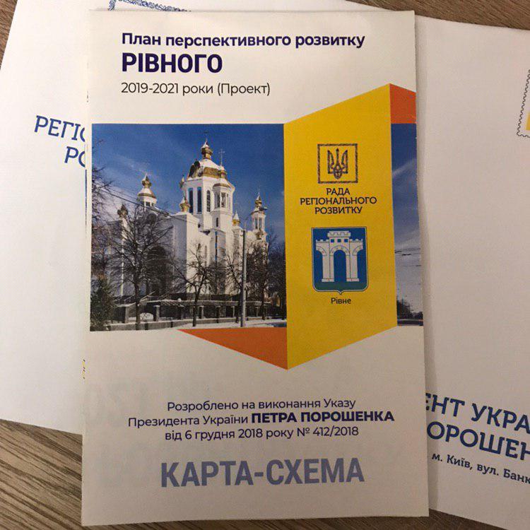 - «Напрями перспективного розвитку Рівного на 2019 – 2021 роки (проект)» із написом «Розроблено на виконання Указу Президента України Петра Порошенка від 6 грудня 2018 року №412/2018», яка містила звернення Президента України, голови Ради регіонального розвитку Петра Порошенка з його зображенням.
