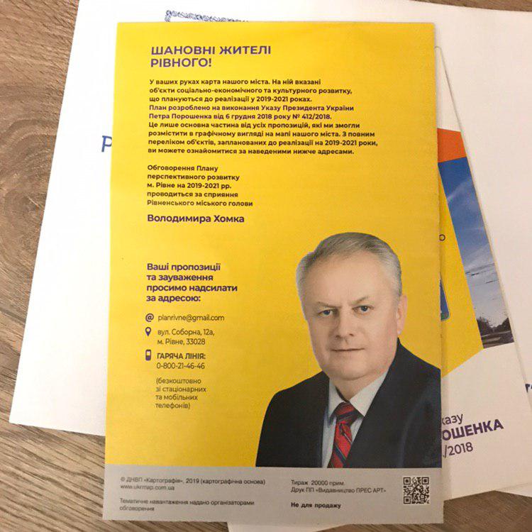Вкінці матеріалу містилось звернення із зображенням міського голови Рівного: «Шановні жителі Рівного! У ваших руках карта нашого міста. На ній вказані об’єкти соціально-економічного та культурного розвитку, що плануються до реалізації у 2019-2021 роках. План розроблено на виконання Указу Президента України Петра Порошенка від 6 грудня 2018 року №412 / 2018. … Обговорення Плану перспективного розвитку м. Рівне на 2019-2021 рр. Проводиться за сприяння Рівненського міського голови Володимира Хомка». Тираж вказано у розмірі 20000 примірників.