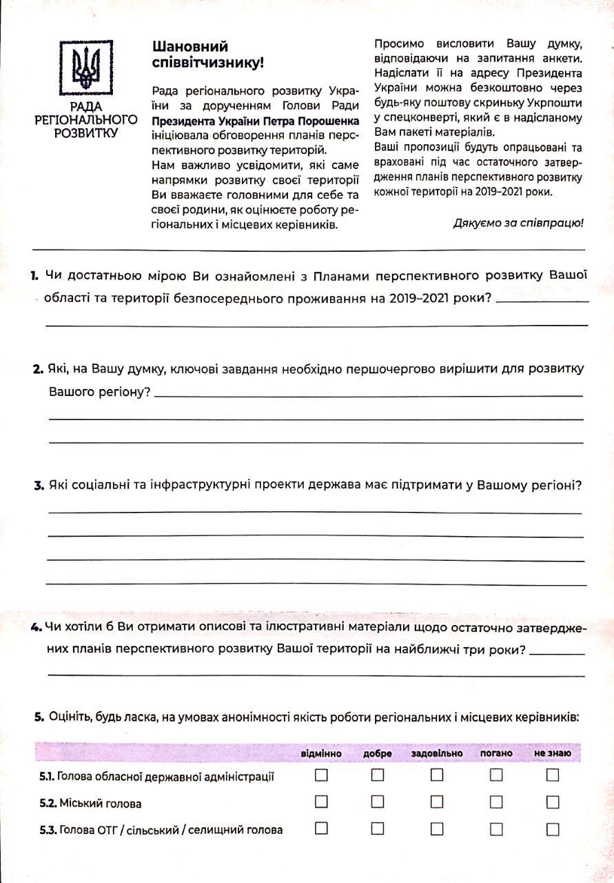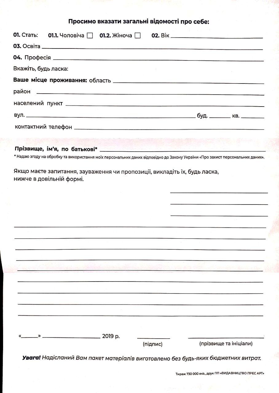 В анкеті зазначено: «Увага! Надісланий Вам пакет матеріалів виготовлено без будь-яких бюджетних витрат» та вказано, що тираж анкети становить 730 000 екземплярів.