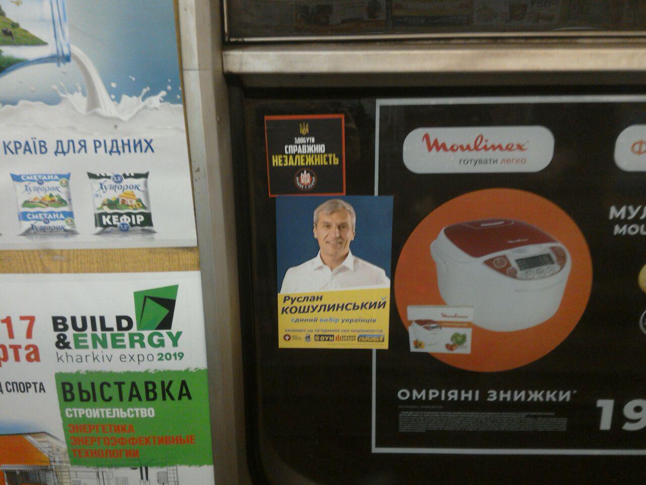 Вдень 13 березня спостерігач помітив усередині та назовні вагону №0661, який курсує по Олексіївській гілці харківського метрополітену, наліпки з написом «Руслан Кошулинський — єдиний вибір українців. Кандидат від об'єднаних сил націоналістів».