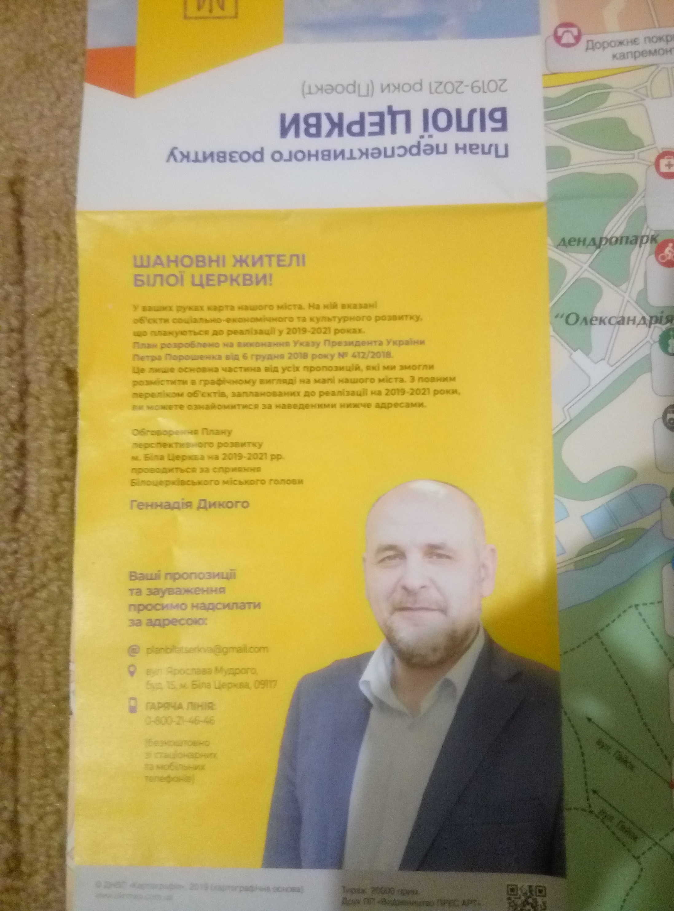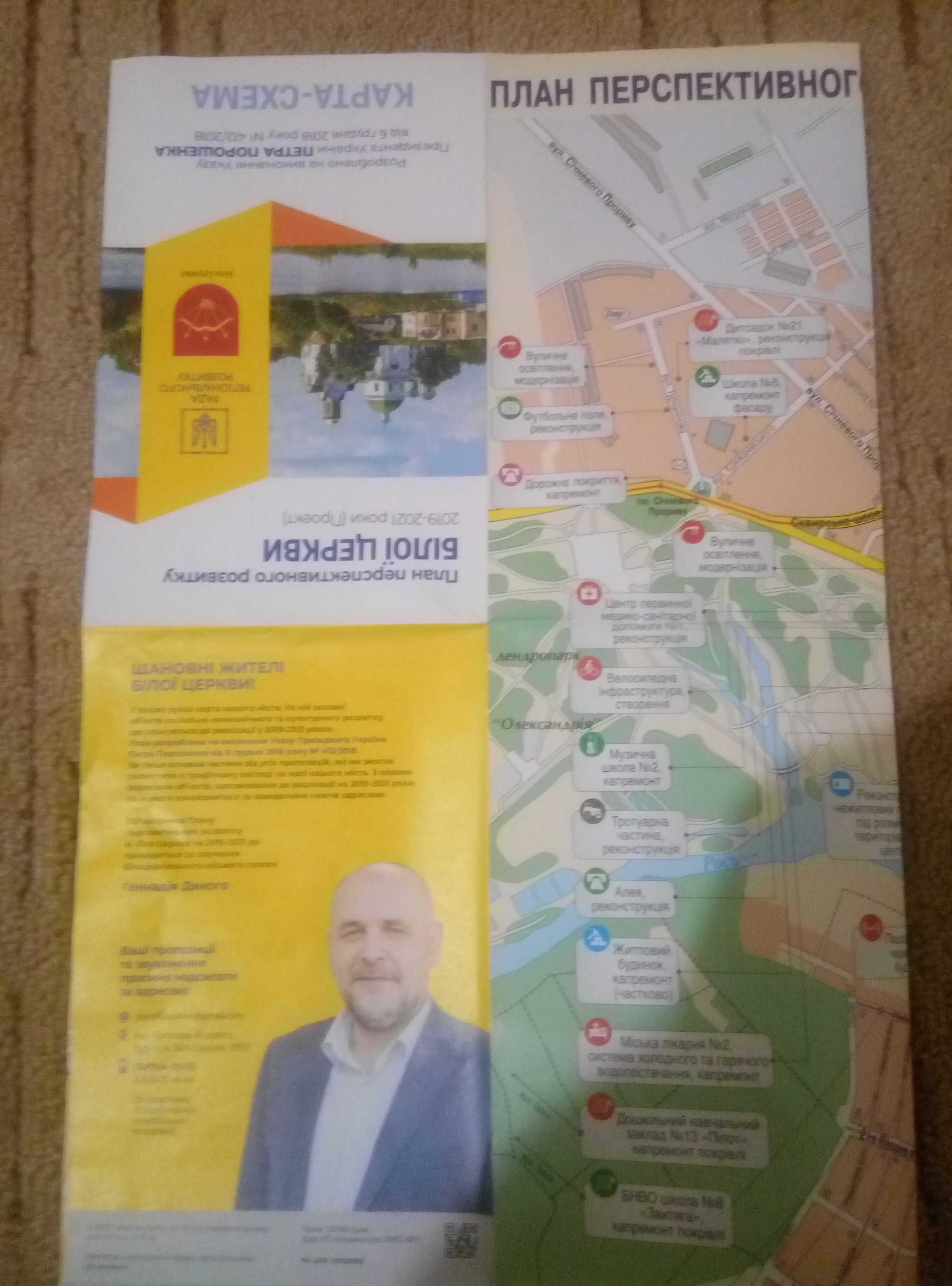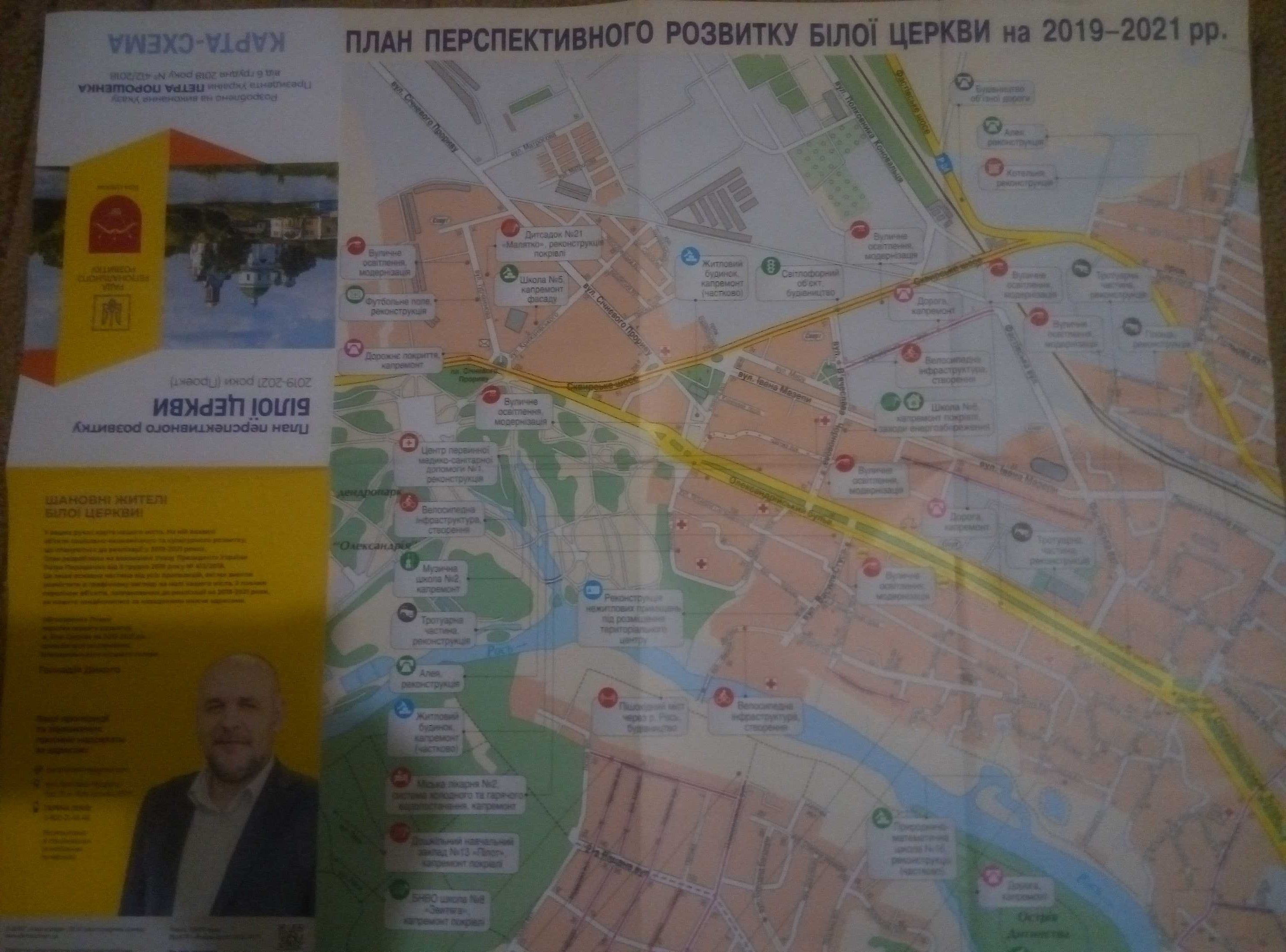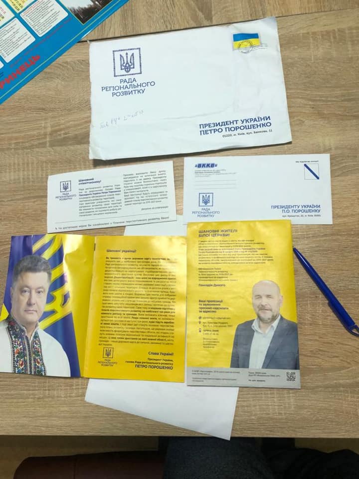 У Білій Церкві по житлових будинках розповсюджують карти міста з «перспективним планом розвитку» . На мапі позначенні об'єкти, які фінансуватимуться в 2019-2021 роках. На поліграфічній продукції зображене фото білоцерківського міського голови, Геннадія Дикого та кандидата у Президенти Петра Порошенка. На конвертах, в яких розповсюджуються ці матеріали є підписи «Рада Регіонального Розвитку» та «Президент України Петро Порошенко».