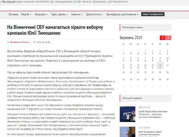 «Від початку березня співробітники СБУ у Вінницькій області почали викликати партійців та прихильників кандидата на пост Президента України Юлії Тимошенко на допити. Повістки й «запрошення на розмову в СБУ» отримали сотні громадян», – зазначається у повідомленні.
