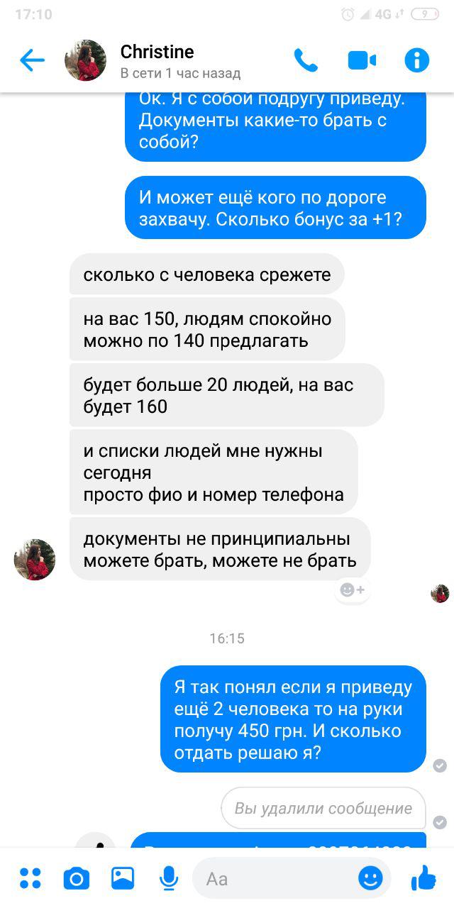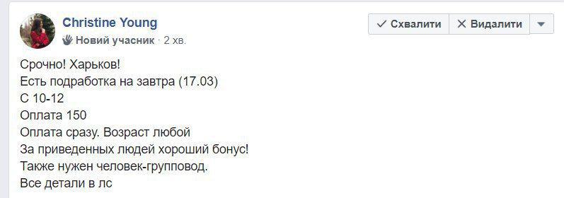 17 березня в харківських пабліках на Facebook почали з’являтись оголошення з пропозицією про те, щоб заробити 150 гривень за дві години роботи. Ці пропозиції розміщував профіль Christine Young, який загалом розмістив близько 30 ідентичних коментарів під найбільш обговорюваними постами в місцевих спільнотах. Окрім цього, два тижні тому з цього профілю масово розсилались коментарі з пропозицією роботи по розповсюдженню газет в Запоріжжі, Кривому Розі і Павлограді.