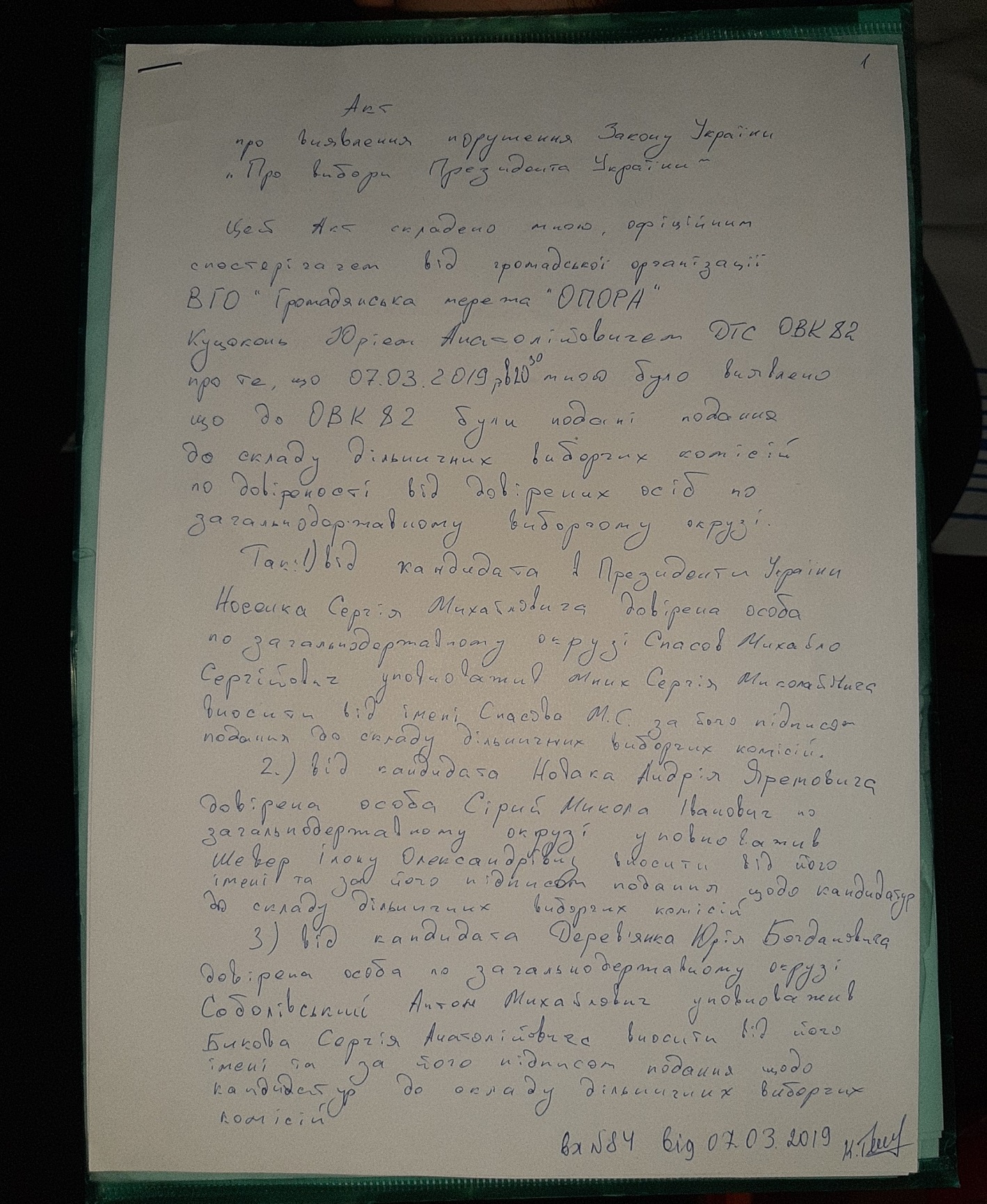 Ці подання прийняли і зареєстрували. На підставі цього факту і підозрою про можливі порушення представник ОПОРИ склав акт до членів комісії за всіма трьома інцидентами.