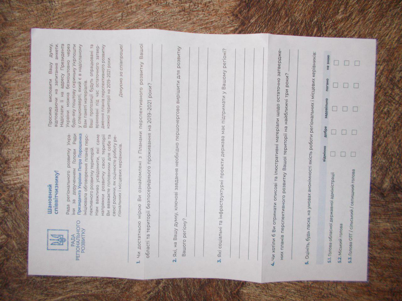 До всього цього додається анкета, в якій, повідомляють, що Рада регіонального розвитку України за дорученням Голови Ради Президента України Петра Порошенка ініціювала обговорення планів перспективного розвитку територій, і пропонують надсилати пропозиції з цього приводу Президенту України в спеціальному конверті. На місці поштової марки на конверті написано «Не підлягає оплаті».