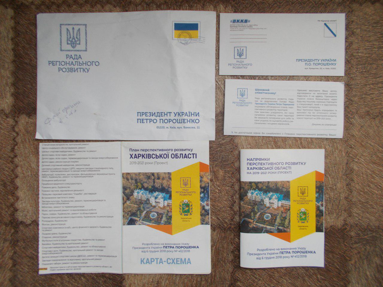 У конвертах з написами «Рада регіонального розвитку. Петро Порошенко» вкладена брошура «Напрямки перспективного розвитку Харківської області на 2019-2021 роки (проект)».