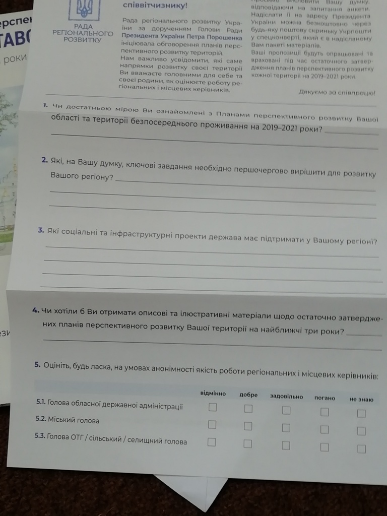 До ОПОРИ звернулись мешканці Гадяча, до яких ввечері 17 березня додому завітали невідомі та вручили конверт «Ради регіонального розвитку». За словами розповсюджувачів, вони проводять соцопитування від імені Президента, та попросили відповісти на питання відносно оцінки діяльності чинного Президента, де треба було оцінити діяльність Порошенка за шкалою оцінювання від 1 до 5. Після цього розповсюджувач заповнив на бланку анкети адресу проживання, передав конверт «Ради регіонального розвитку» та попросив розписатися задля підтвердження доставки матеріалів.