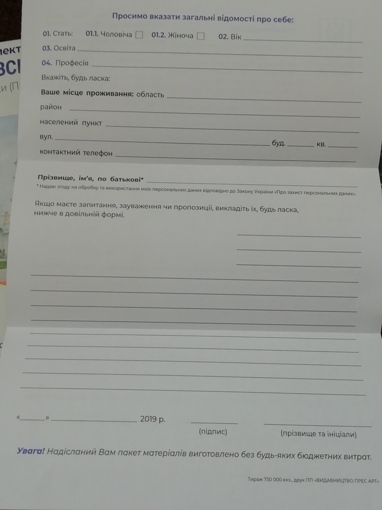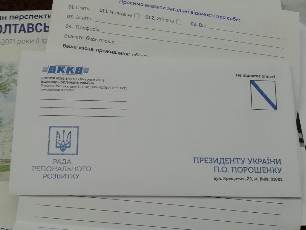 Сам конверт містить буклет «Напрямки перспективного розвитку Полтавської області 2019–2021 роки (проект)», «Карту-схему плану перспективного розвитку області (проект)», конверт для відправлення відповіді щодо анкети, анкета стосовно перспективного розвитку області та території безпосереднього проживання на 2019-2021 роки. Причому анкету стосовно перспективного розвитку області включає питання, де просять на умовах анонімності оцінити якість роботи регіональних та місцевих керівників. Проте на звороті цієї анкети розміщена анкета де необхідно заповнити свої персональні дані: ПІБ, телефон, адресу проживання та електронну пошту. У кінці анкети зазначено, що пакет матеріалів виготовлено без будь-яких бюджетних витрат.