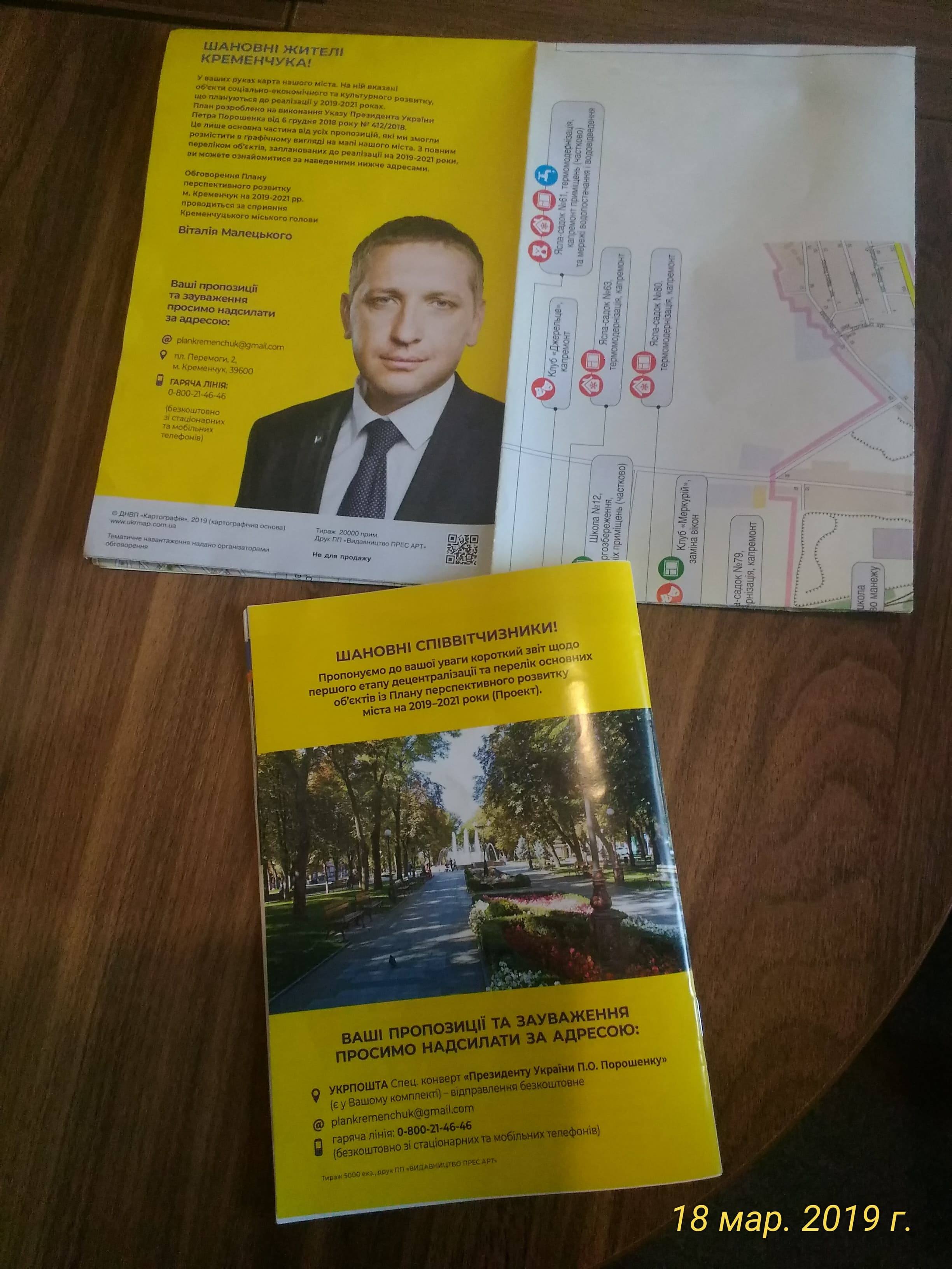 18 березня подібні конверти з матеріалами були зафіксовані у поштових скриньках будинків в місті Кременчук. В буклеті плану регіонального розвитку Кременчука, окрім звернення Порошенка, розміщувалось й фото міського голови Кременчука Віталія Малецького та зазначалось, що «обговорення плану перспективного розвитку Кременчука на 2019-2021 рр. проводиться за сприянням Кременчуцького міського голови Віталія Малецького».