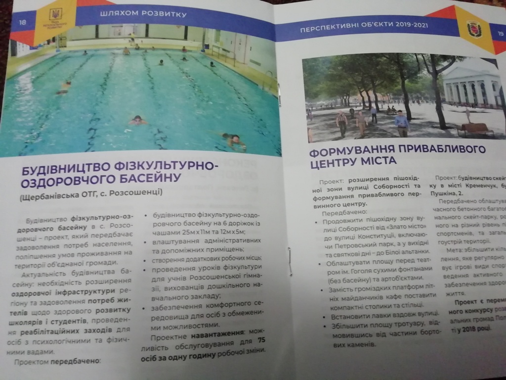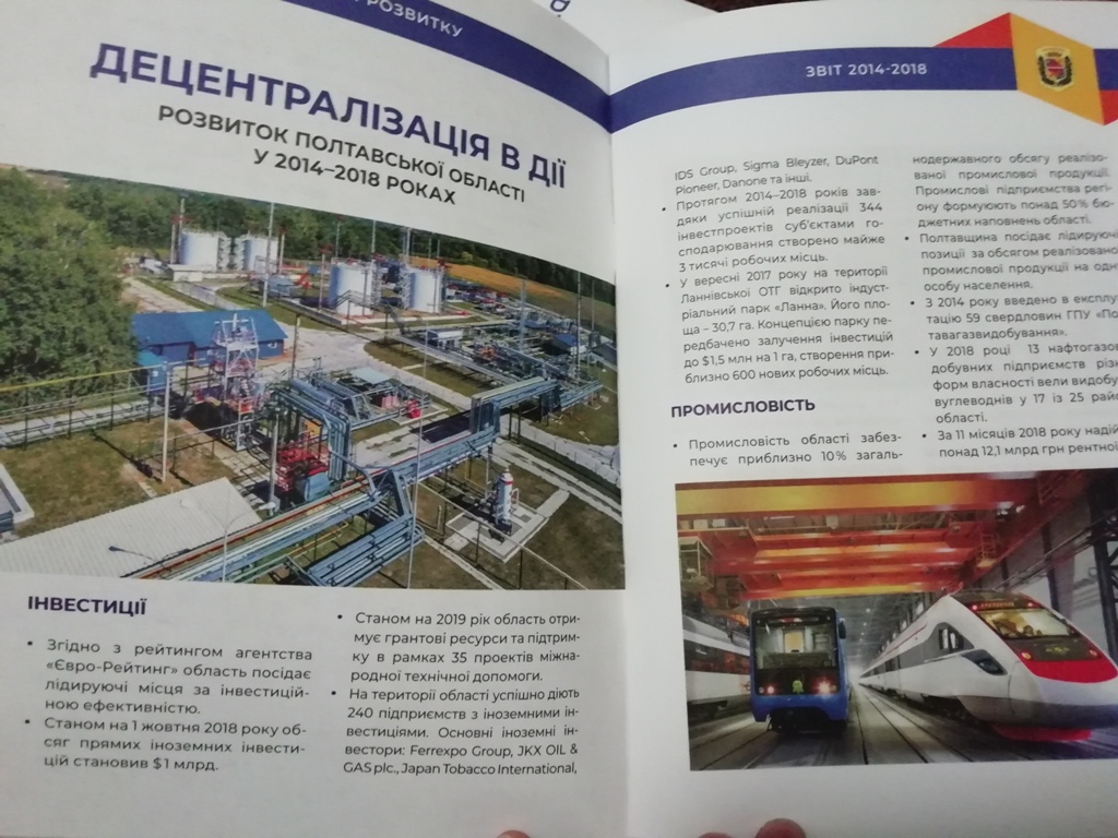 На першій сторінці буклету розміщено зображення Петра Порошенка зі зверненням до громадян України. Буклет описує децентралізацію в дії – розвиток Полтавської області протягом 2014-2018 років та акцентує на перспективних об’єктах 2019-2021 років.