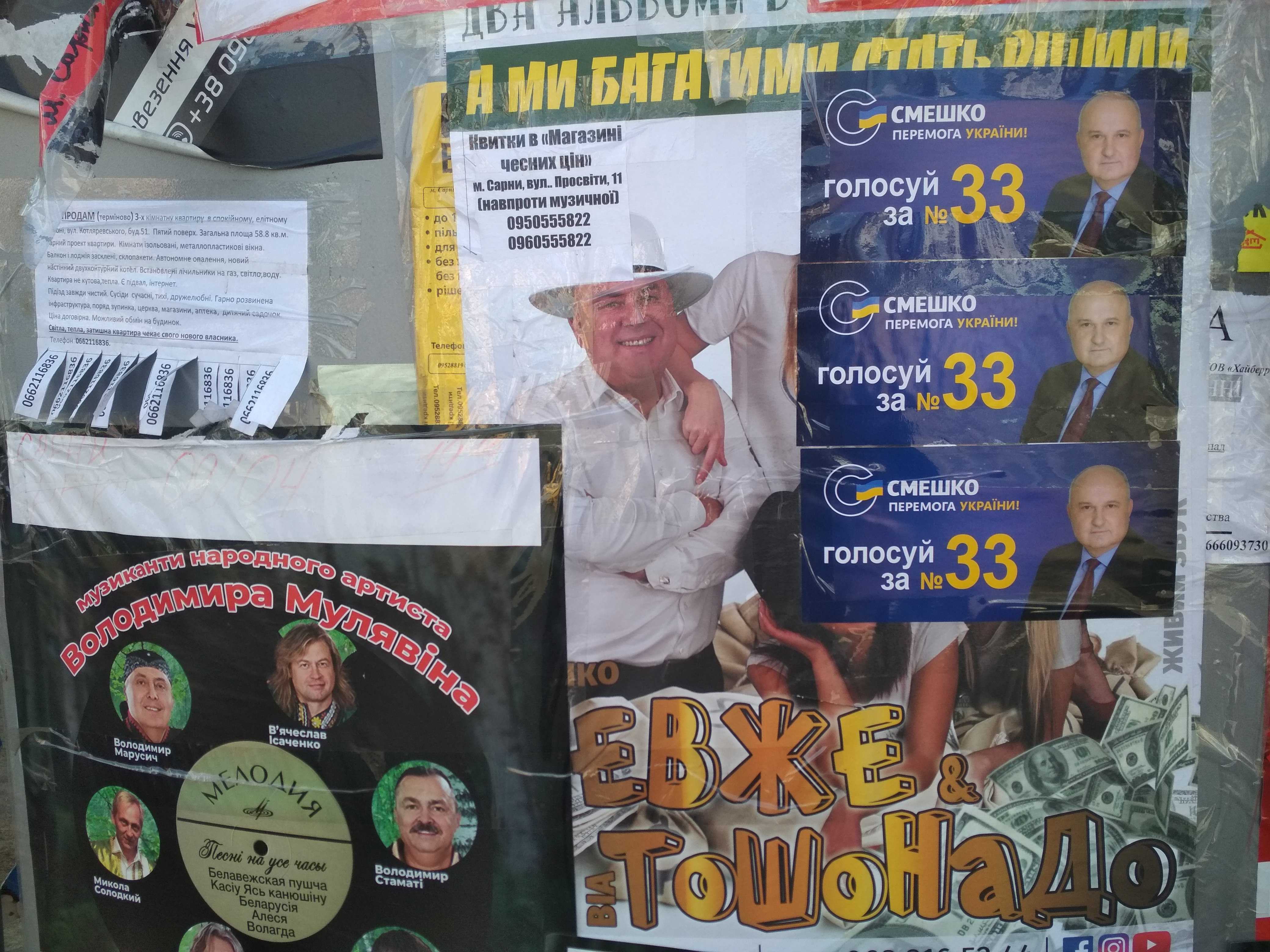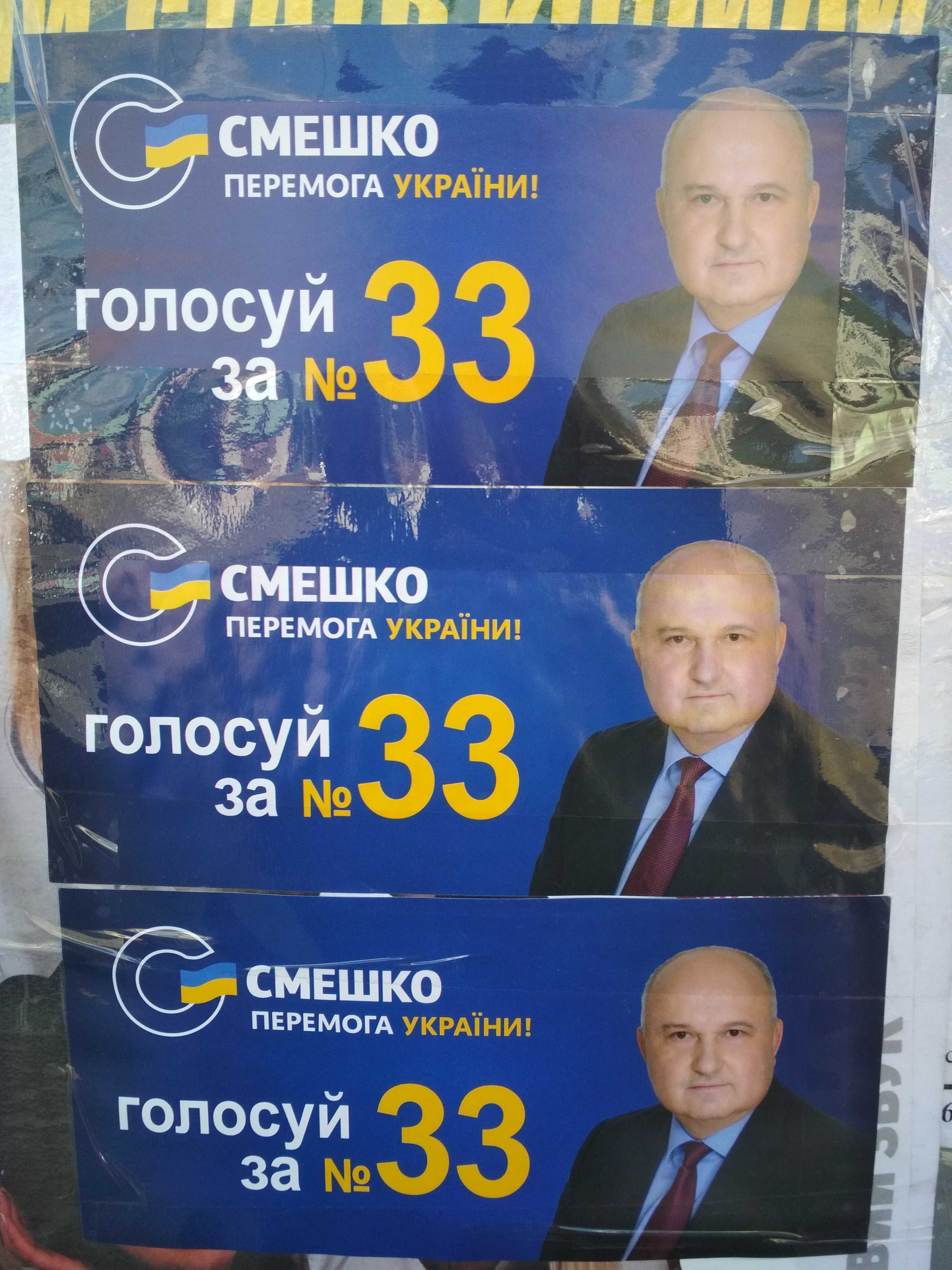 - Ігоря Смешка з написом «Смешко. Перемога України. Голосуй за№33» із зображенням прапора України;