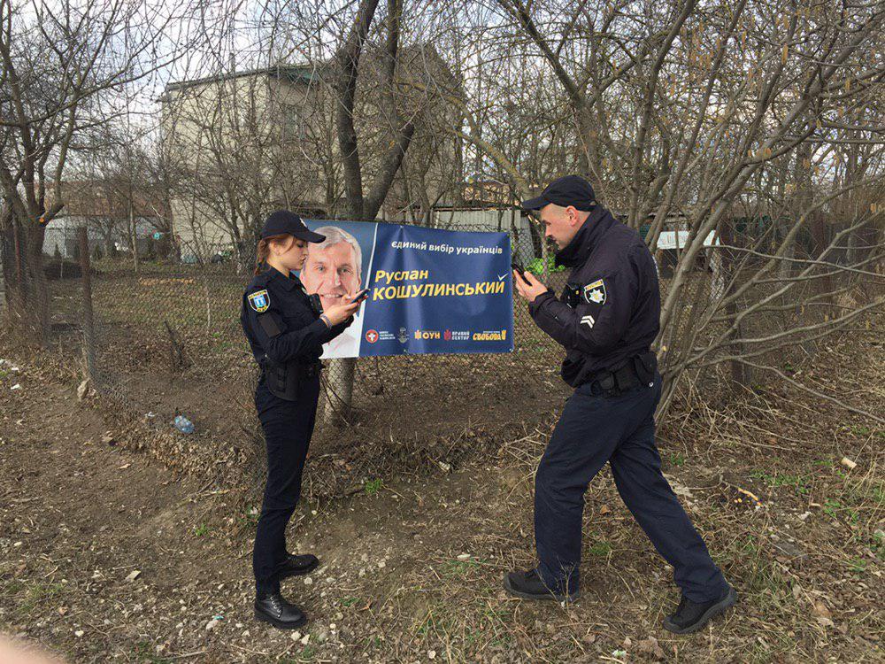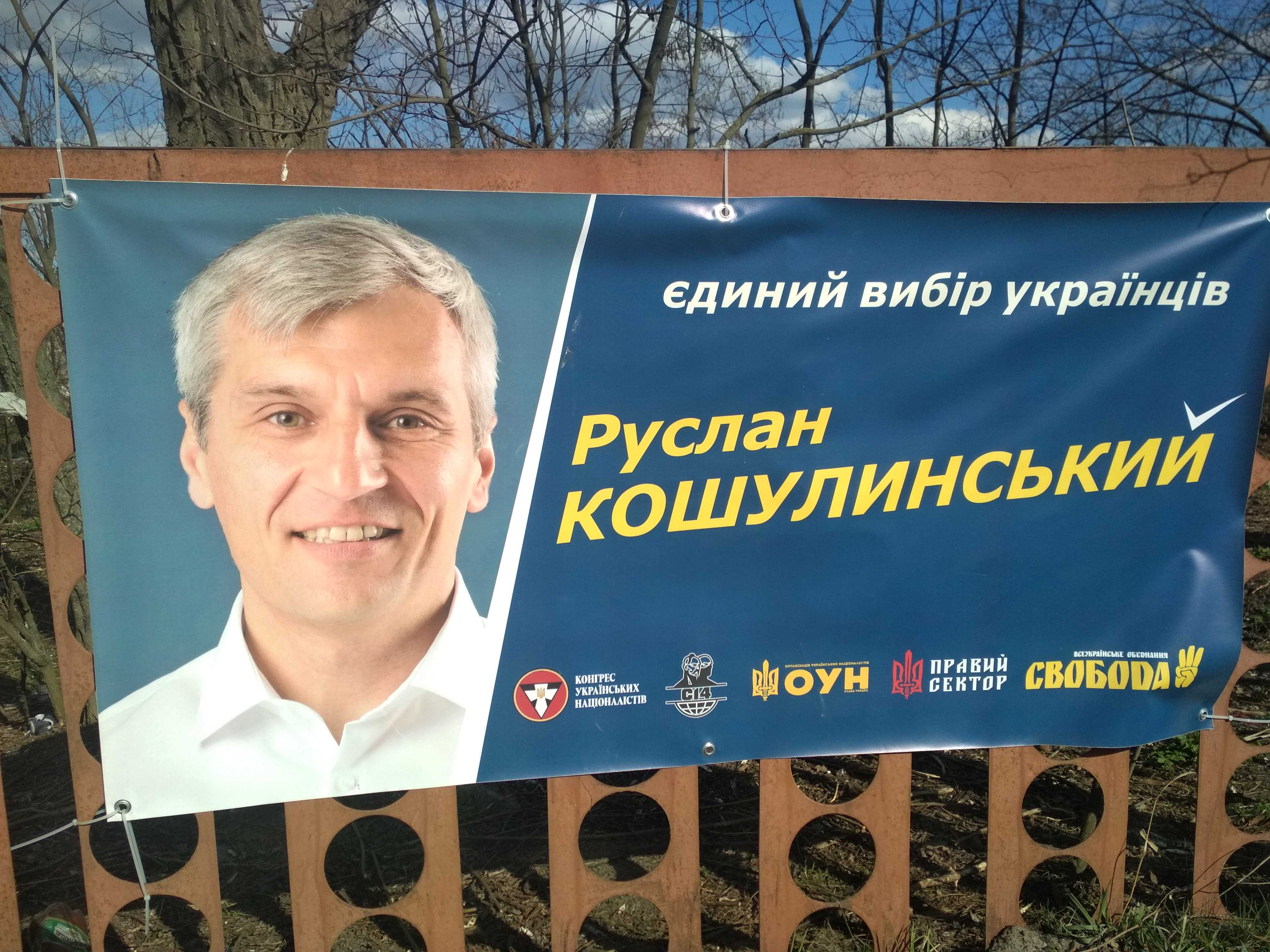 - Руслана Кошулинського з написом «Єдиний вибір українців. Руслан Кошулинський» та логотипами Всеукраїнського об’єднання «Свобода», Національно-визвольного руху «Правий сектор», Організації українських націоналістів (ОУН), Конгресу українських націоналістів та української праворадикальної громадської організації «С 14».
