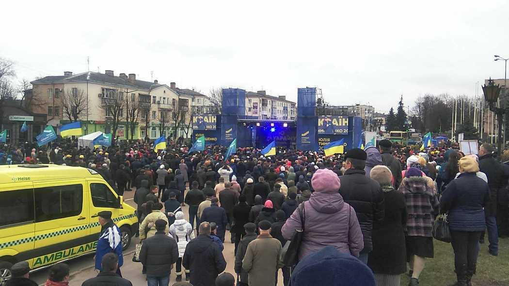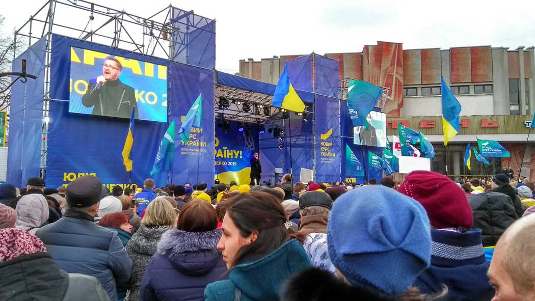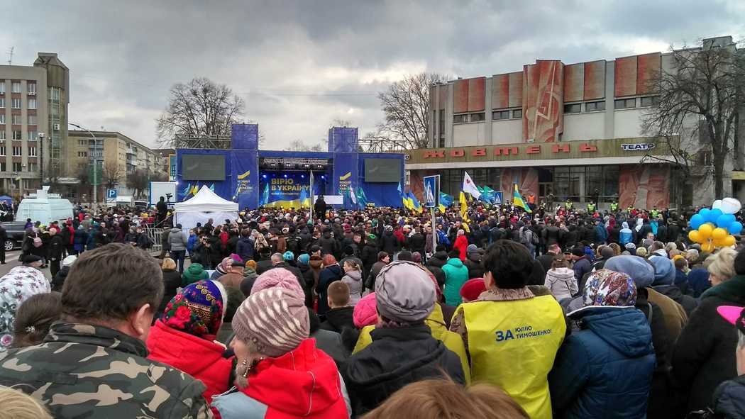 Заздалегідь анонсована зустріч Юлії Тимошенко проходила на майдані Корольова. Послухати кандидатку в Президенти зібралися кількасот людей. Поблизу майдану, біля обласної філармонії ім. Святослава Ріхтера представники ОПОРИ зафіксували кілька автобусів з табличками «Нерегулярні перевезення». Біля сцени – люди одягнуті в жилетки з написами «ЗА Юлія Тимошенко», дехто тримає в руках агітаційні прапори. На сцені спершу виступив український співак Олександр Пономарьов, потім – Юлія Тимошенко.