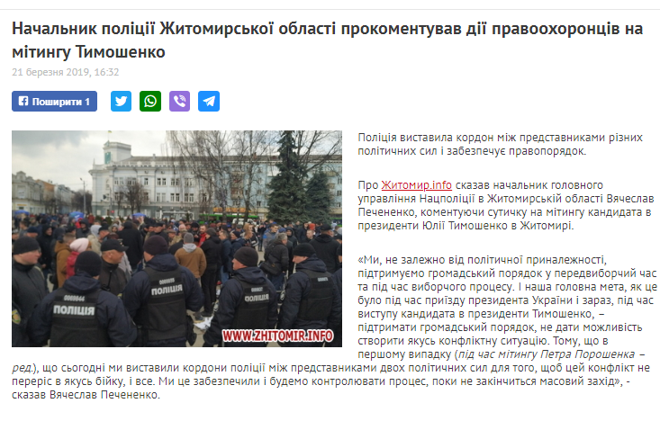 «Ми, незалежно від політичної приналежності, підтримуємо громадський порядок у передвиборчий час та під час виборчого процесу. І наша головна мета, як це було під час приїзду Президента України і зараз, під час виступу кандидата в Президенти Тимошенко, – підтримати громадський порядок, не дати можливість створити якусь конфліктну ситуацію. Тому, що в першому випадку (під час мітингу Петра Порошенка – ред.), що сьогодні ми виставили кордони поліції між представниками двох політичних сил для того, щоб цей конфлікт не переріс в якусь бійку, і все. Ми це забезпечили і будемо контролювати процес, поки не закінчиться масовий захід», - сказав Вячеслав Печененко», – йдеться у новині на сайті.