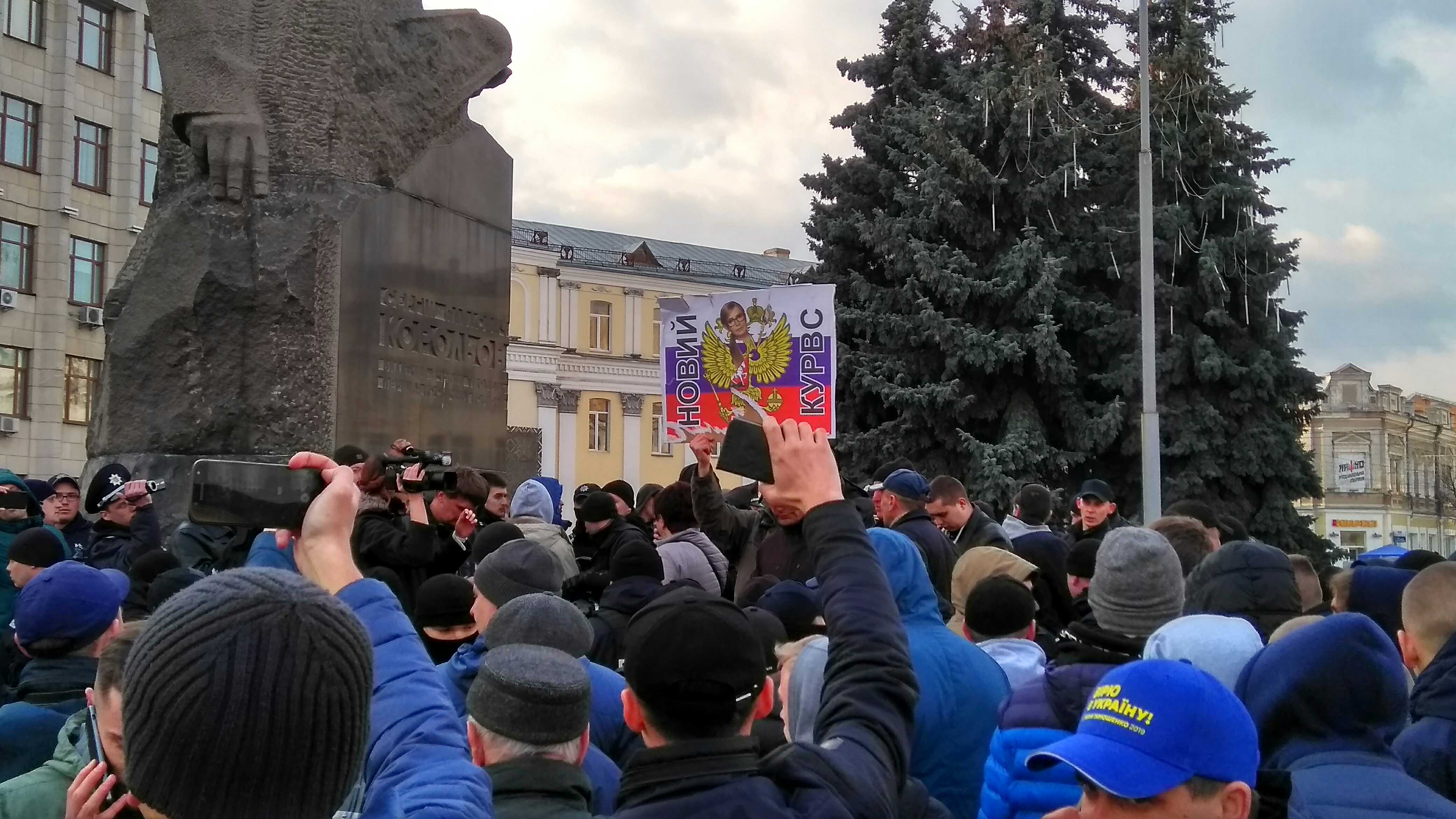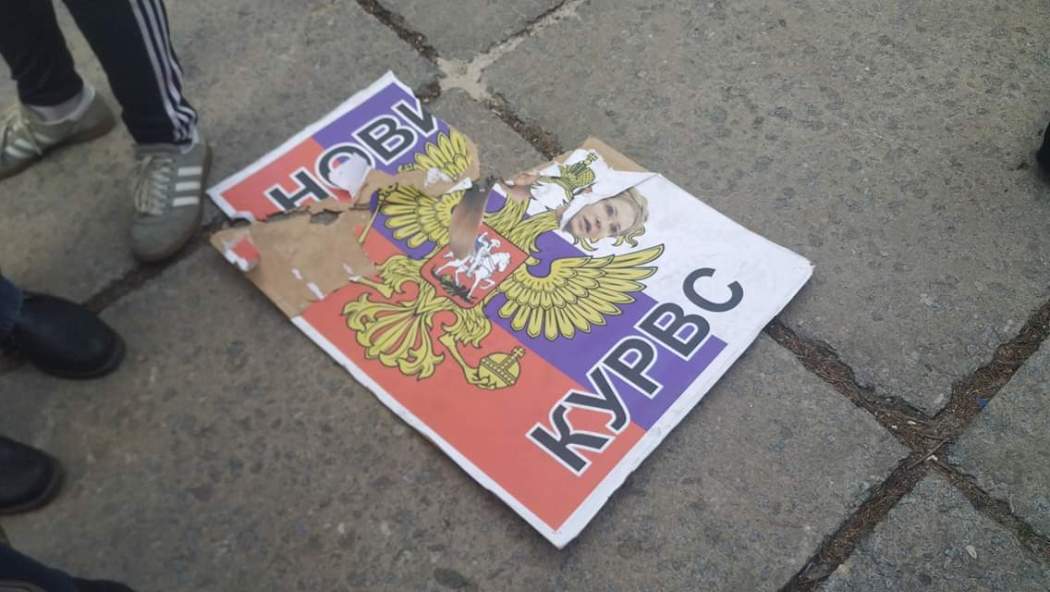 «Активісти стояли поблизу пам'ятника Корольову, до сцени не дійшли. Розгорнули плакати, на одному було зображення зовні схоже на герб Російської Федерації і напис «Новий курвс» та великий транспарант з написом «Юля Росія». Одразу до них підбігли молоді хлопці, на одязі виднілися жовто-блакитні стрічки та значки з написом «Вірю» і почали рвати плакати. Між прихильниками та опонентами почалася штовханина і сварка, у ситуацію втрутилася поліція. Правоохоронці не допустили продовження конфлікту та створили бар'єр між учасниками конфлікту. Словесні образи продовжилися. Один з активістів підняв розірваний плакат і продовжував тримати, його закидали яйцями», – розповів спостерігач ОПОРИ Георгій Федорук, який перебував на місці події.