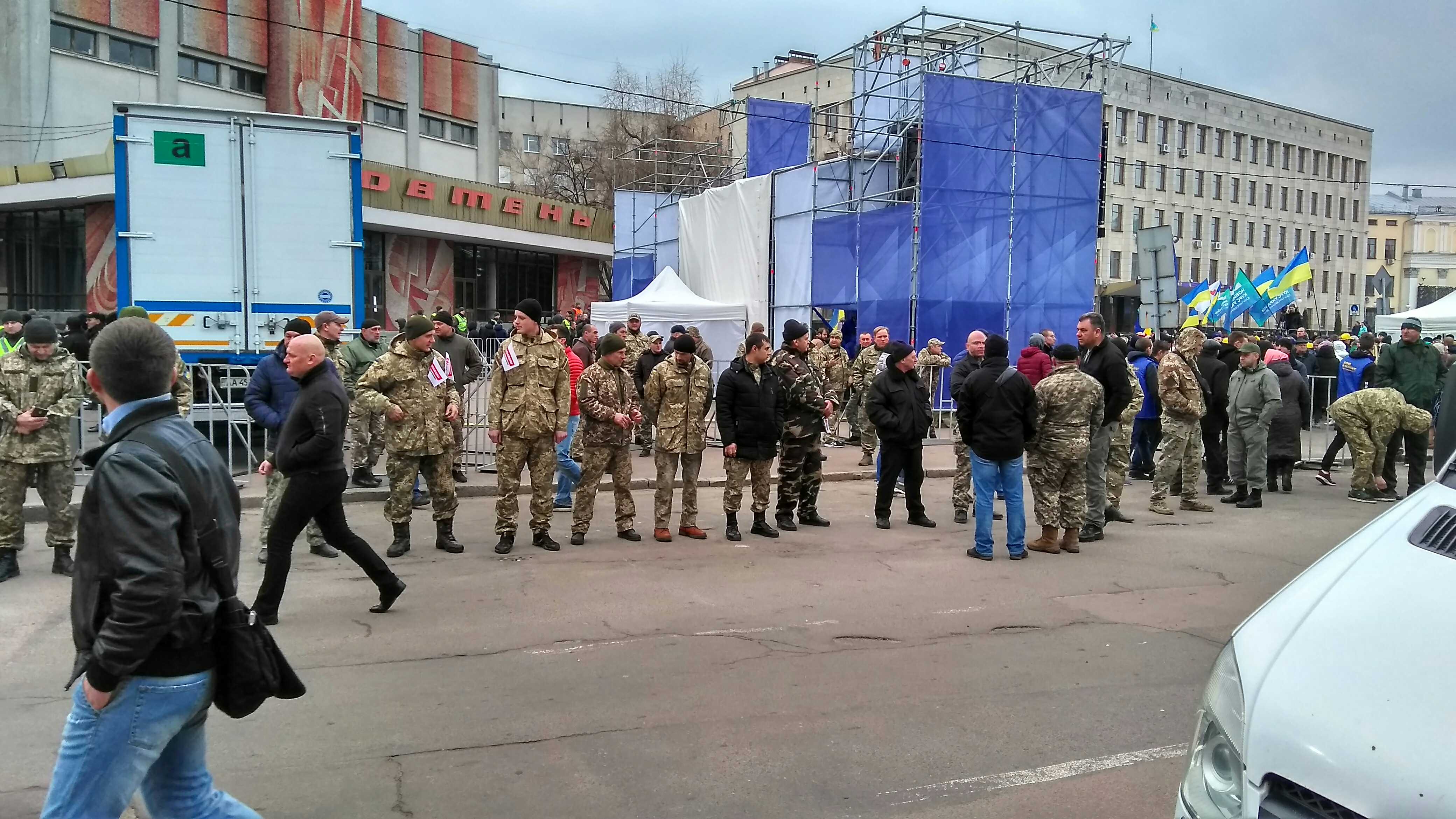 «Нас була група десь чоловік 10-15, ми взяли плакати і йшли, щоб стати там на сходах і розгорнути ці плакати, щоб це цивілізовано було, так як коли Порошенко приїздив, ніхто ж не заважав там стояти, кричати, плакати тримати. Вже на підходах стояли якісь кордони з молодиків, які почали рвати плакати, штовхати нас, збили до купи і вже тоді підійшла поліція, оточила нас, мабуть, щоб не били. Поліція стояла в стороні, коли рвали ці плакати, спостерігала, а вже тоді взяли в кільце, щоб охороняти. Нам ще поліція сказала, що ми самі винні, сказали: треба було нас попередити, ми б вам тоді коридор організували, ви пройшли б куди захотіли, вас би ніхто не чіпав. Т, що вони бачили, що ми йдемо, це не було для них знаком. Я підійшов, звернувся, кажу: надайте охорону я ось тут стану на постаменті Корольова з плакатом, щоб висловити свою позицію. Я розумів, що до сцени не дійду, бо там кордони з молодиків. Поліція заявила, а що ми будемо вам охорону давати, вам же нічого не загрожує, вас ніхто не чіпає. Я тільки рушив з плакатом, відбувся напад, вирвали цей плакат. Тоді вже два поліцейських стали біля мене, я знайшов обломки і став з плакатом, потім ще пару разів нападали і виривали. Поліція в стороні розмовляла з цими молодиками. Кандидат в Президенти не бажає слухати якусь іншу сторону. Стільки було ресурсу задіяно і поліція, і ця «тітуня». Я хочу висловити свою позицію, я не гадаю, що я не у вільній країні».