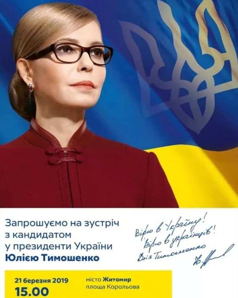 У Житомирі 21 березня під час зустрічі кандидатки в Президенти Юлії Тимошенко з виборцями на майдані Корольова сталася сутичка між молодиками спортивної зовнішності та активістами, які прийшли з плакатами проти Тимошенко. Декілька людей розгорнули транспаранти з написами «Юля Росія»» та «Новий курвс», однак висловити свою позицію їм завадили молодики із значками «Вірю» та жовто-блакитними стрічками.