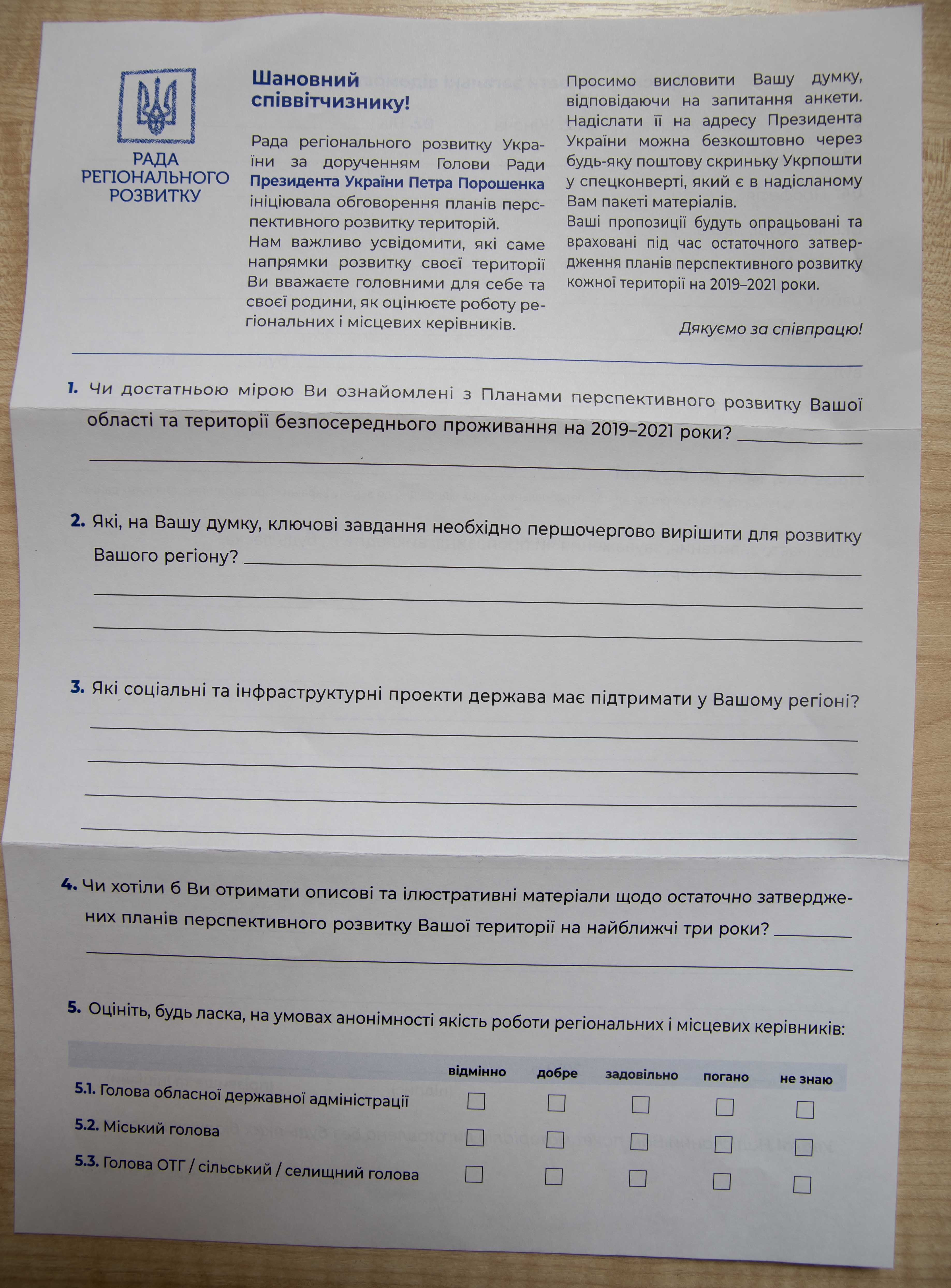 Питання анкети стосуються обізнаності респондента з Планом перспективного розвитку області, з’ясування ключових завдань та проектів, які, на думку респондента, треба втілити першочергово. Також пропонується оцінити на умовах анонімності роботу місцевих керівників і висловитися щодо згоди чи незгоди «отримати описові та ілюстративні матеріали щодо остаточно затверджених планів перспективного розвитку Вашої території на найближчі три роки». У заключних пунктах анкети респондента просять вказати загальні відомості про себе (стать, вік, освіта, професія, місце проживання, телефон), далі містяться графа «Прізвище, ім’я, по батькові. Надаю згоду на обробку та використання моїх персональних даних відповідно до Закону України «Про захист персональних даних»; графа для запитань, зауважень чи пропозицій; графа «Дата, підпис, прізвище та ініціали», також примітка, що надісланий пакет матеріалів «виготовлено без будь-яких бюджетних витрат».
