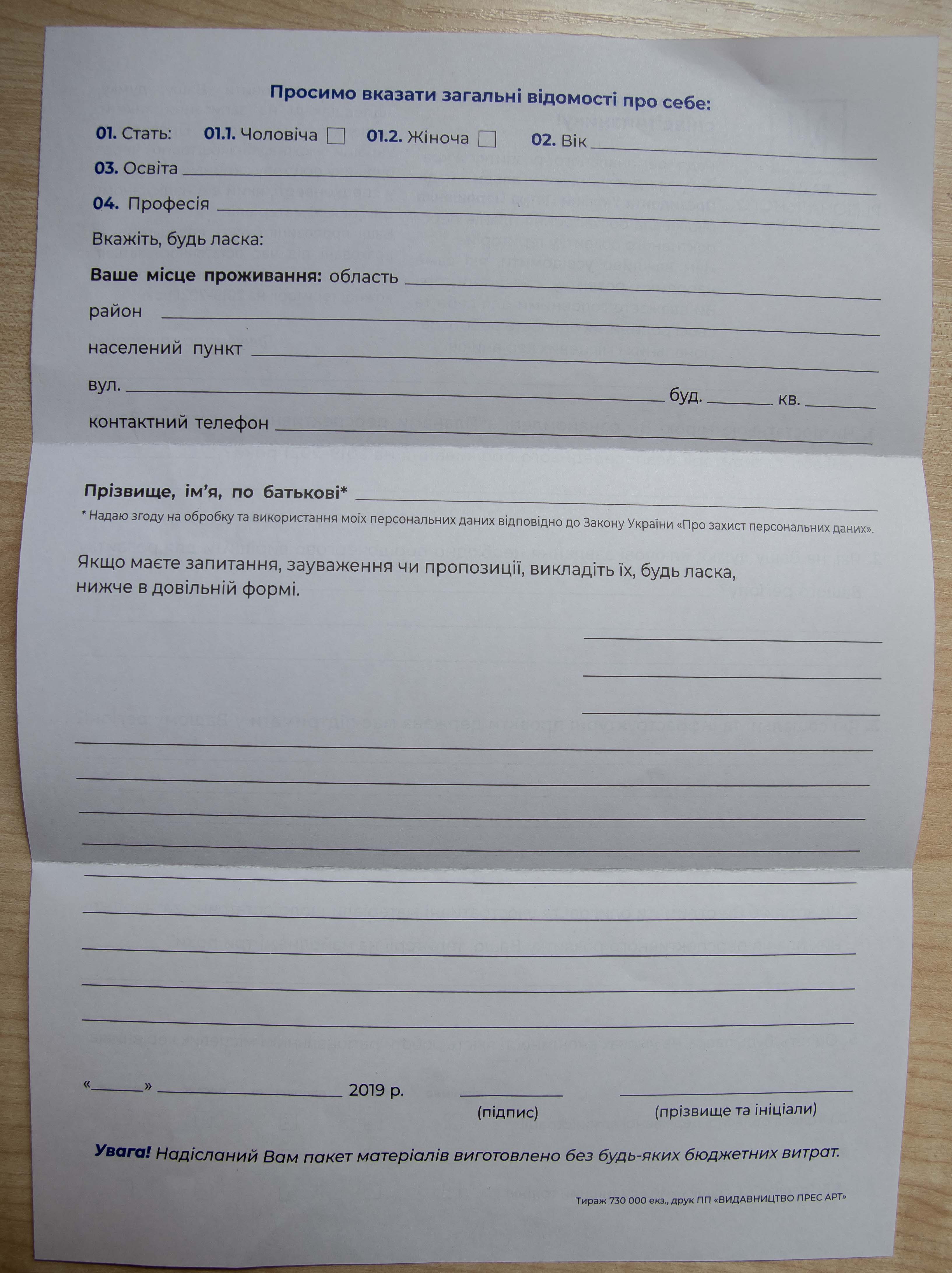 Також у  конверті містяться кольорова карта територіальних громад області та анкета. На карті міститися звернення із зображенням народного депутата: «Шановні жителі Чернівецької області! У ваших руках карта Буковини. На ній вказані об’єкти соціально-економічного та культурного розвитку, що плануються до реалізації у 2019-2021 роках. План розроблено на виконання Указу Президента України Петра Порошенка від 6 грудня 2018 року №412 / 2018… Обговорення Плану перспективного розвитку Чернівецької області на 2019-2021 рр. проводиться за сприяння народного депутата України Івана Рибака». Тираж теж вказано у розмірі 20 000 примірників.