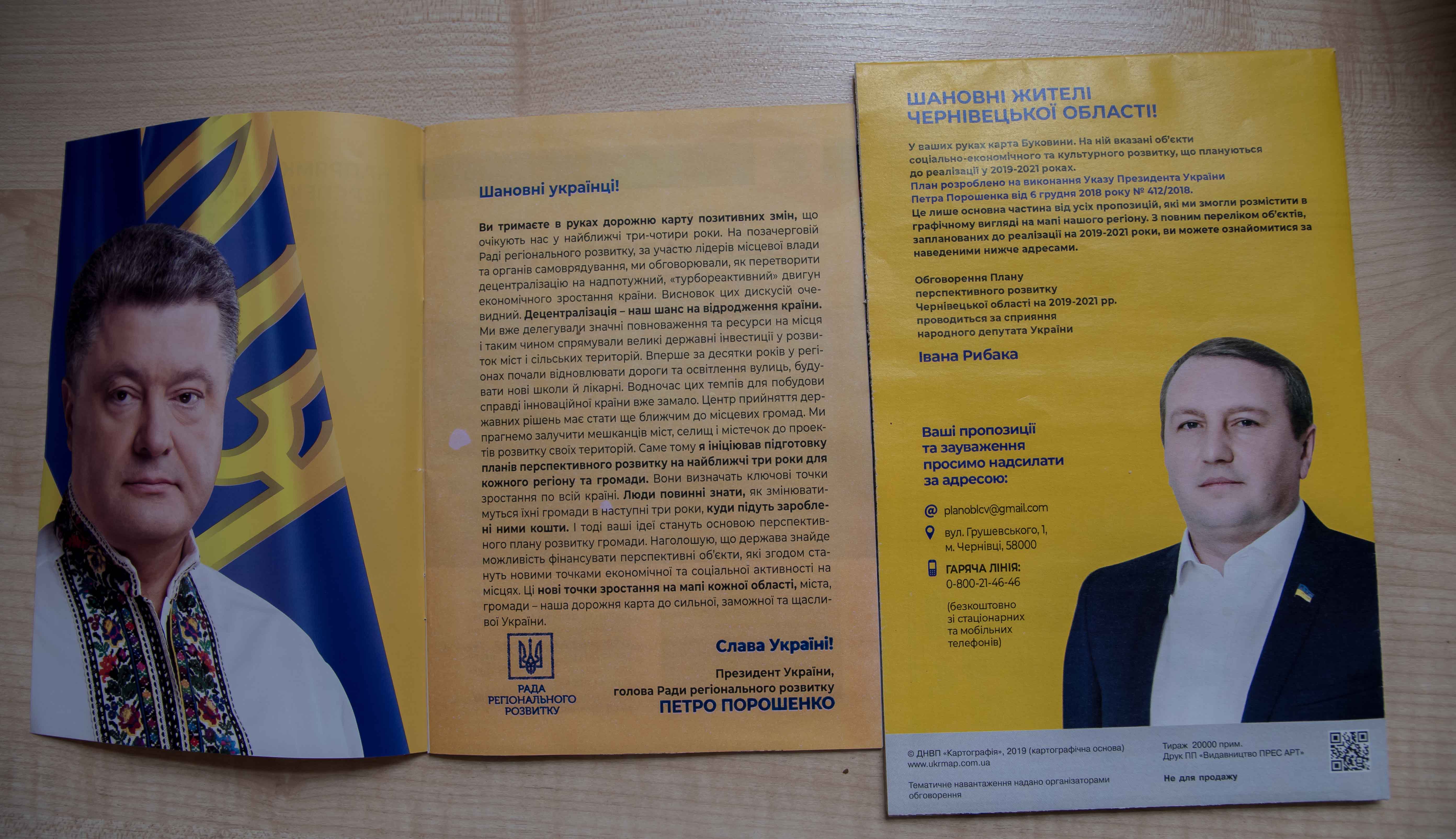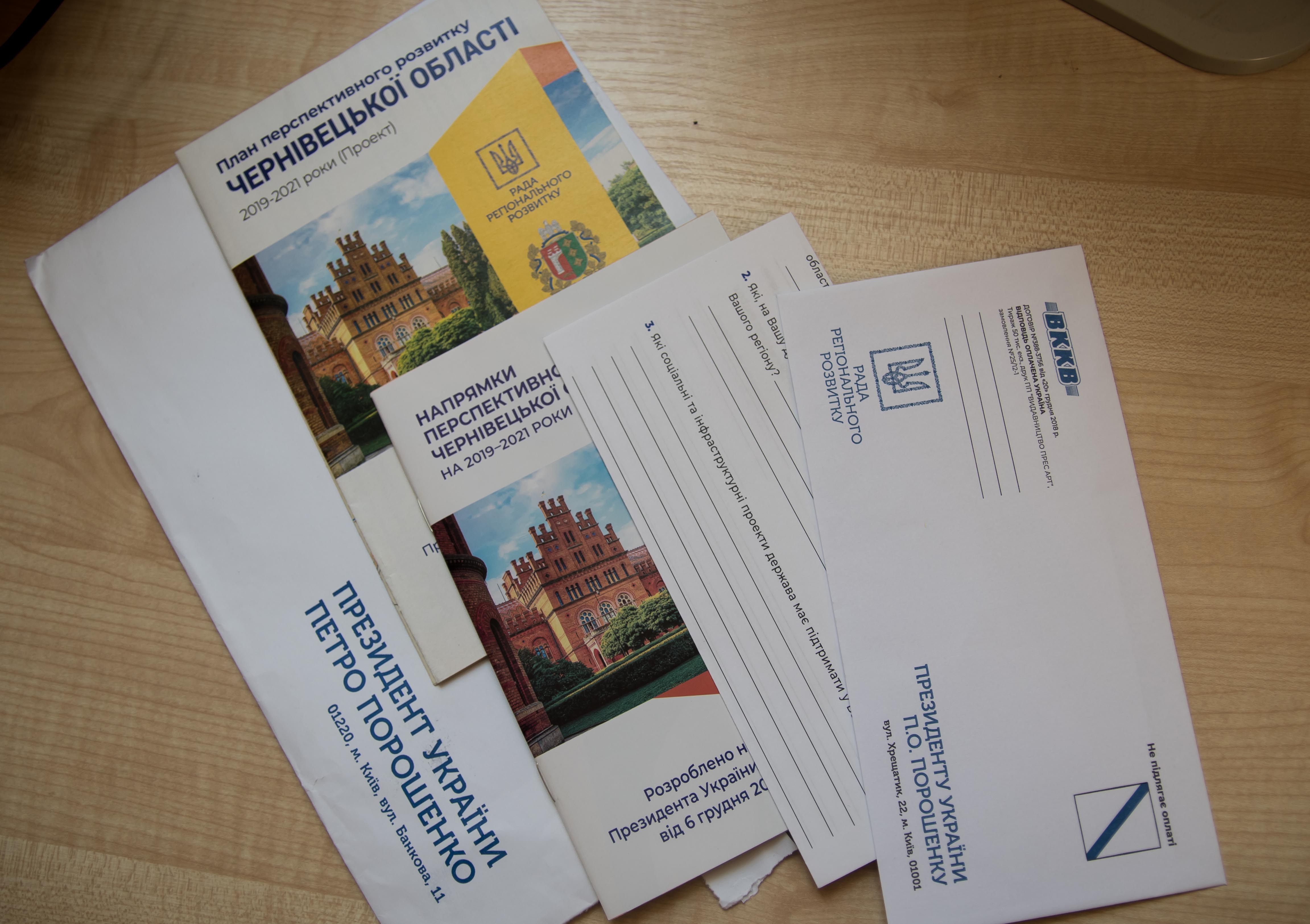 До цього набору інформаційних матеріалів входить брошура «Напрямки перспективного розвитку Чернівецької області на 2019-2021 роки (проект)», на обкладинці якої вказано «Рада регіонального розвитку. В кінці матеріалу зазначено: «Ваші пропозиції та зауваження просимо надсилати за адресою: Укрпошта спец. конверт «Президенту України П.О. Порошенку» (є у Вашому комплекті) – відправлення безкоштовне»,  вказано тираж 20 000 екземплярів, друк ПП «ВИДАВНИЦТВО ПРЕС АРТ».