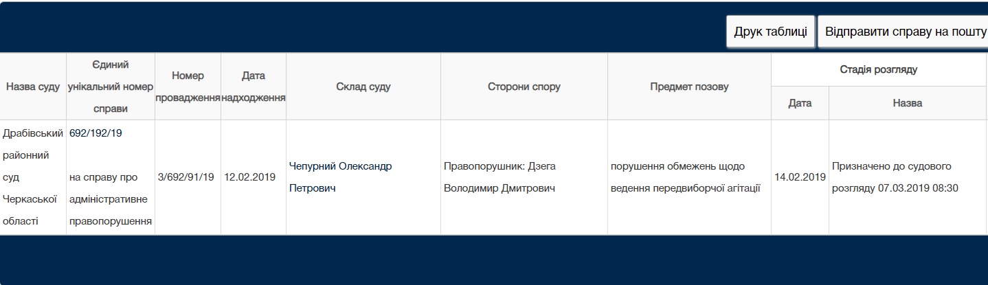 Окрім в того, у березні суд розглянув матеріали справи щодо адмінправопорушення щодо голови Драбівської районної ради Володимира Дзеги.