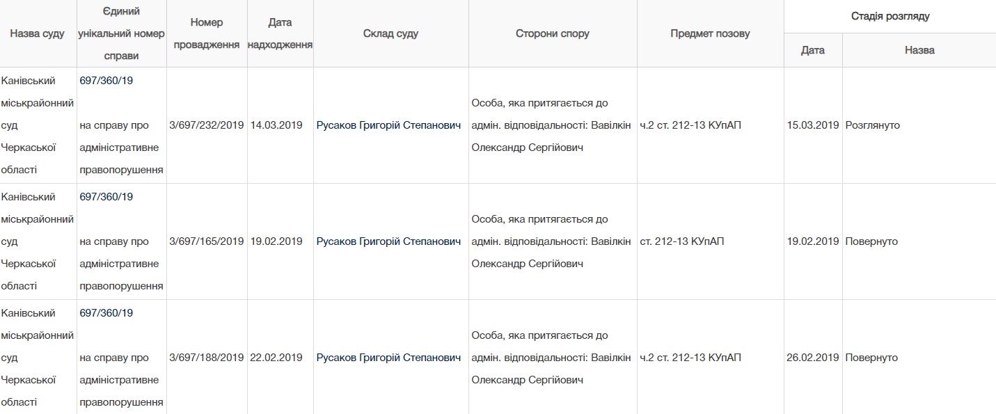 15 березня до суду надійшли матеріали про притягнення до адміністративної відповідальності за частиною 2 статті 212-13 КУпАП. Згідно з матеріалами, особа, яка притягується до відповідальності, не була присутня під час складання протоколу, окрім цього, її пояснення і відомості про неї були відібрані під час розмови по телефону, що порушує КУпАП. 5 березня суд постановив повернути справу до Черкаського відділку поліції для усунення недоліків.