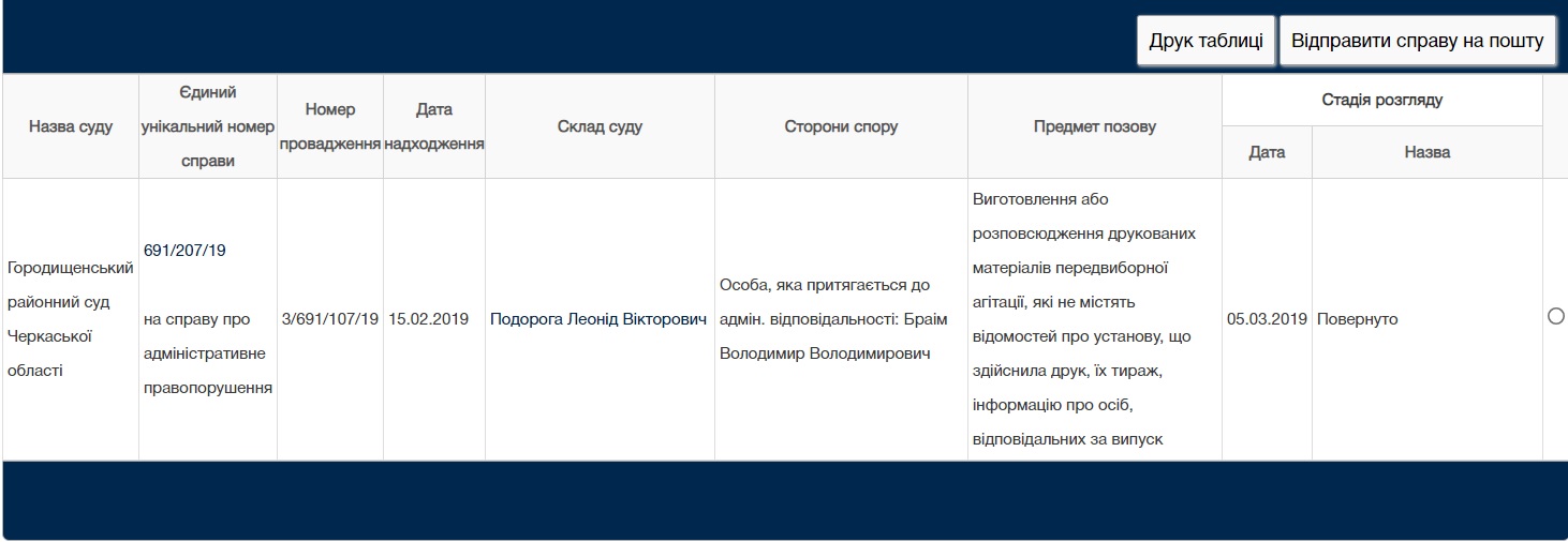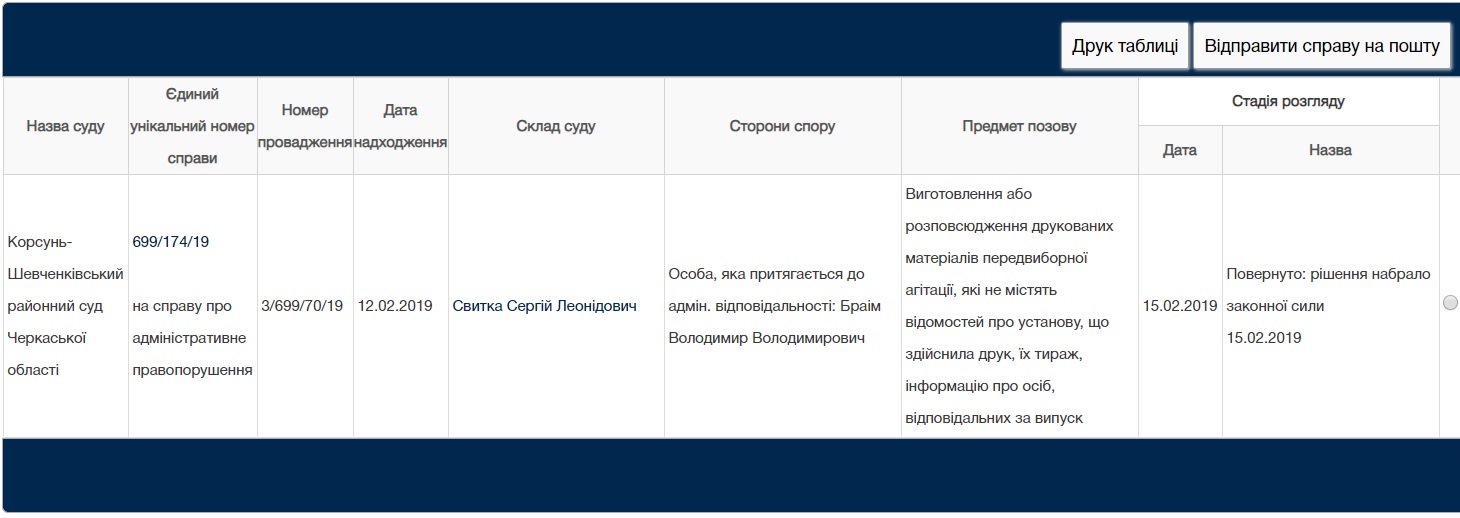 19 лютого до суду надійшов протокол про адміністративне правопорушення за ознаками статті 212-13 КУпАП. Суд встановив, що протокол не відповідає вимогам закону. У ньому відсутні відомості, що уповноваженим органом виявлено саме агітаційний матеріал, що стосується виборчого процесу. Також у протоколі не зазначені норми виборчого законодавства, які було порушено, та не вказані свідки правопорушення, їхні анкетні та адресні дані. Суд постановив повернути Канівського відділу поліції матеріали для дооформлення.