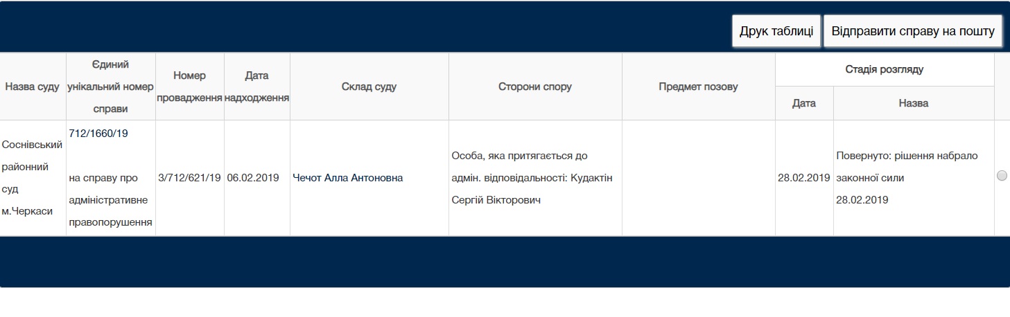 6 лютого до суду надійшли матеріали адміністративної справи за частиною 2 статті 212-13 КУпАП. Суд встановив, що поліцією були проігноровані вимоги законодавства щодо складання протоколу, бо в матеріалах справи відсутні пояснення свідків та інформація про роз’яснення правопорушнику його прав та пояснення щодо обставин справи. 28 лютого матеріали повернуто до Черкаського відділу поліції для належного оформлення.