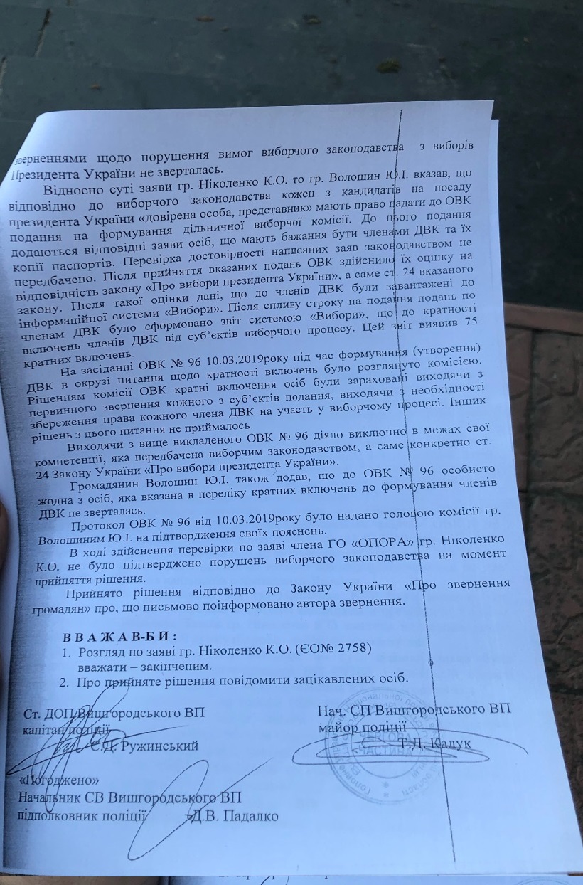 Втім, працівники поліції не внесли дану заяву до Єдиного реєстру досудових розслідувань, оскільки не виявили факту адміністративного чи кримінального правопорушення. У висновку Вишгородського відділу поліції ГУ Нацполіції у Київській області йдеться, що в ході здійснення перевірки по заяві, не було підтверджень порушення виборчого законодавства, на момент прийняття рішень. Крім того, у висновку були включені і пояснення голови ОВК №96 щодо ситуації: «На засіданні ОВК №96 10.03.2019 року підчас формування (утворення) ДВК в окрузі питання щодо кратності включень було розглянуто комісією. Рішенням комісії ОВК кратні включення осіб були зараховані, виходячи з первинного звернення кожного з суб'єктів подання, виходячи з необхідності збереження права кожного члена ДВК на участь у виборчому процесі. Інших рішень з цього питання не приймалось. Виходячи з вищевикладеного, ОВК 96 діяло виключно в межах своєї компетенції, яка передбачена виборчим законодавством, а саме конкретно ст. 24 ЗУ «Про вибори Президента України».
