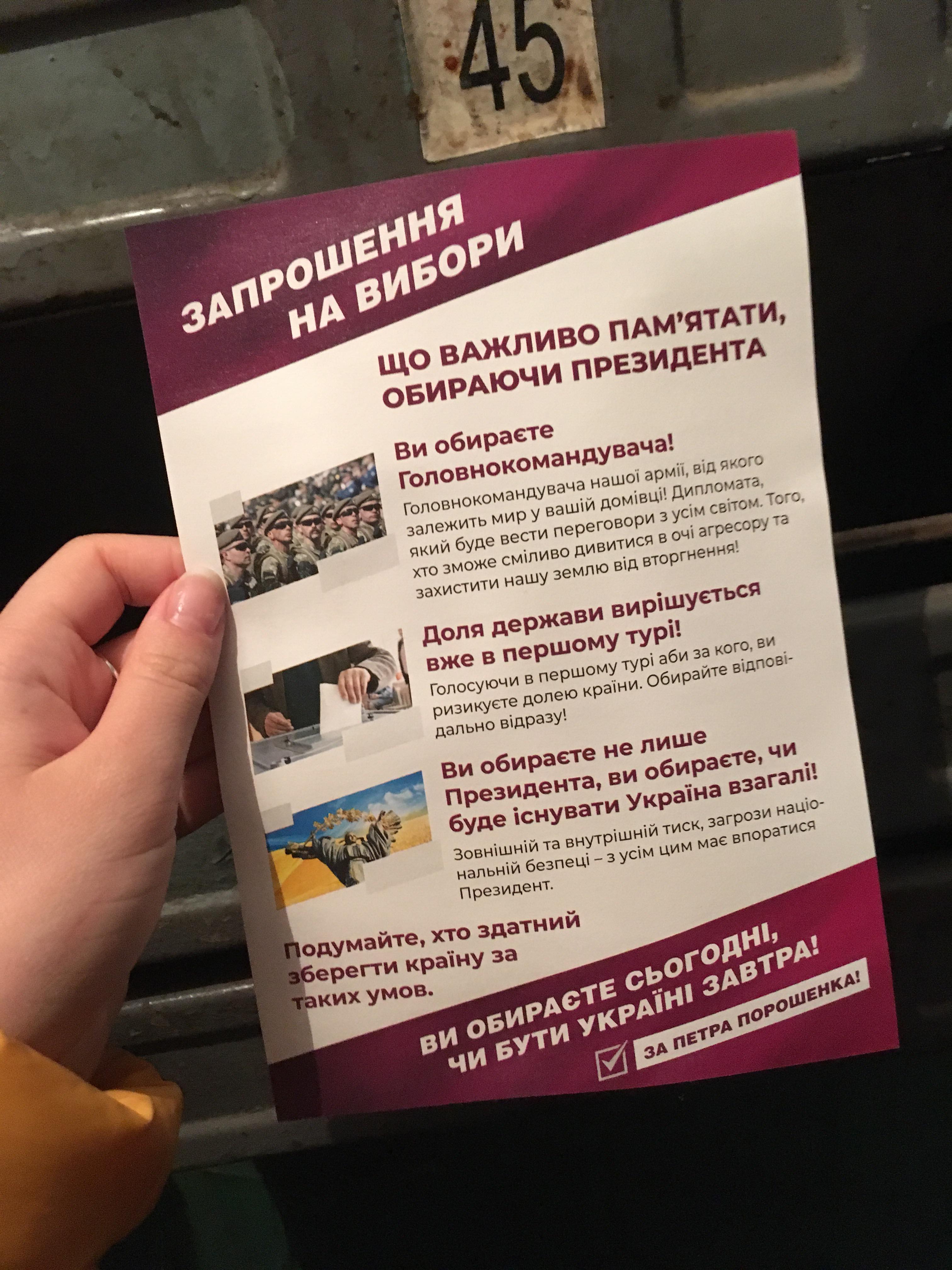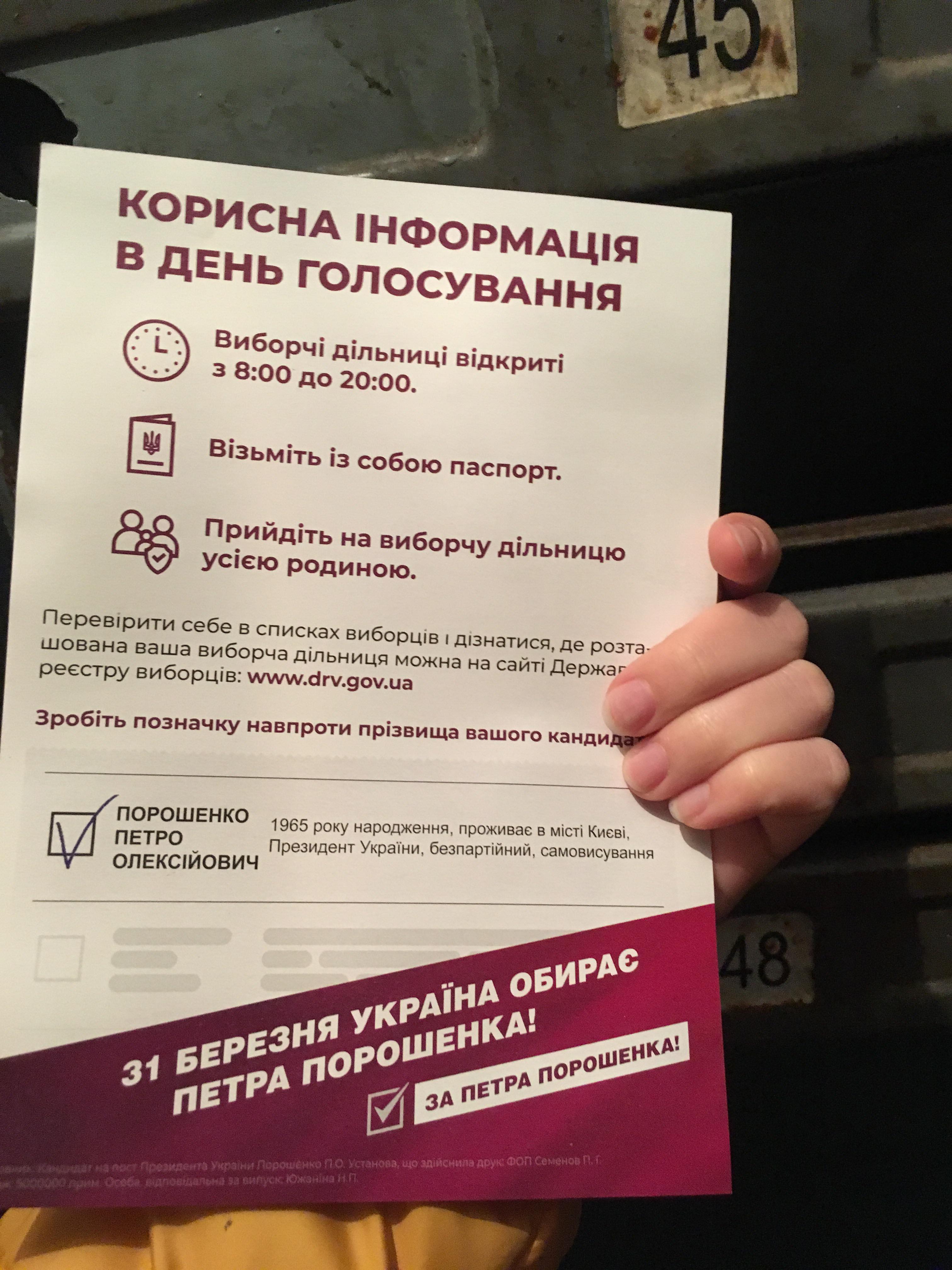 Буклети-запрошення були розкладені у поштові скриньки одного із житлових будинків міста за адресою проспект Гвардійський 27 б. У них міститься детальна інформація відносно того, що потрібно пам’ятати, обираючи Президента, корисна інформація в день голосування. Поряд із цим, внизу буклета великими літерами зазначено, що 31 березня Україна обирає Петра Порошенка.