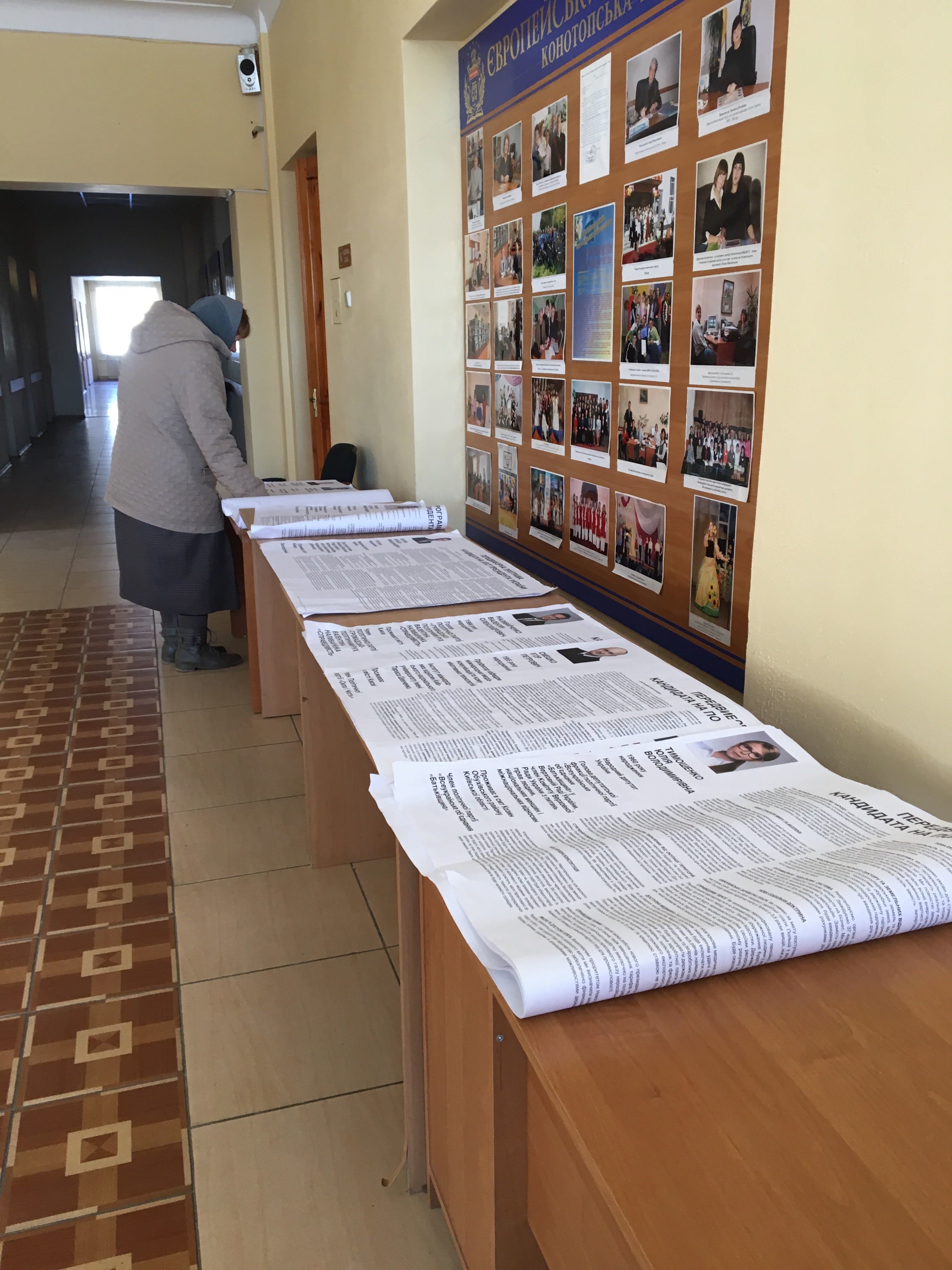 На дільниці № 590766 у Конотопі (ТВО№161) такі ж плакати були розкладені на столах, скріплені степлером з порушенням визначеного законодавством порядку розміщення. Після зауваження омбудсменки із захисту виборчих прав ОПОРИ їх розмістили в алфавітному порядку - так, як того вимагає чинне законодавство.