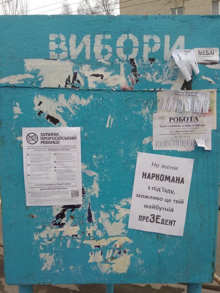 У суботу, 13 квітня, на стенді для передвиборної агітації, що на вул. Інститутській, спостерігачі ОПОРИ зафіксували дві листівки, які мають ознаки «чорного піару» проти кандидата на пост Президента України Володимира Зеленського. У вихідних даних одної із листівок зазначено, що вона надрукована на особистому принтері Юрченка О. С. тиражем 50 тис. примірників на замовлення Логурьова К. В. Інша листівка не містить жодних вихідних даних.