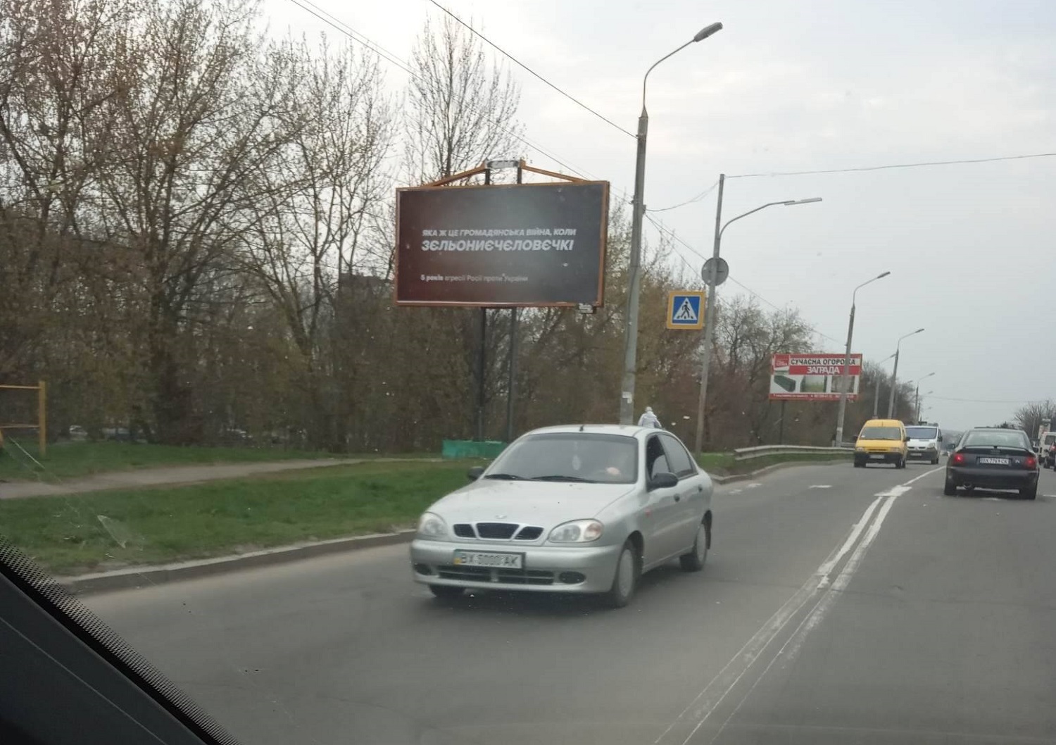 Білборд із написом «Яка ж це громадянська війна, коли ЗЄЛЬОНИЄЧЄЛОВЄЧКІ. 5 років агресії Росії проти України» спостерігачі виявили 11 квітня на вулиці Толстого у Хмельницькому. Білборд не містить жодних вихідних даних.