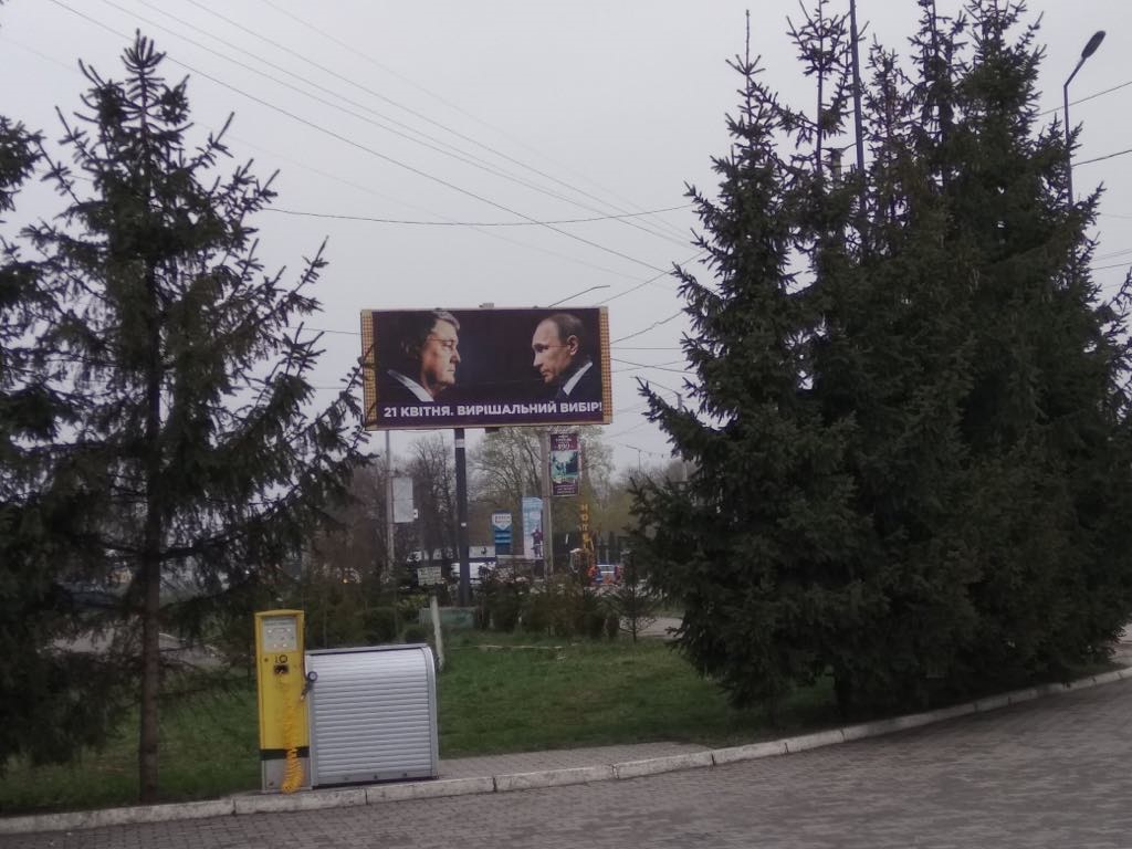 12 квітня в Хмельницькому зафіксовано білборди кандидата на пост Президента України Петра Порошенка із зображенням очільника Російської Федерації. На білбордах зазначено: «21 КВІТНЯ. ВИРІШАЛЬНИЙ ВИБІР!», а також є необхідні вихідні дані.