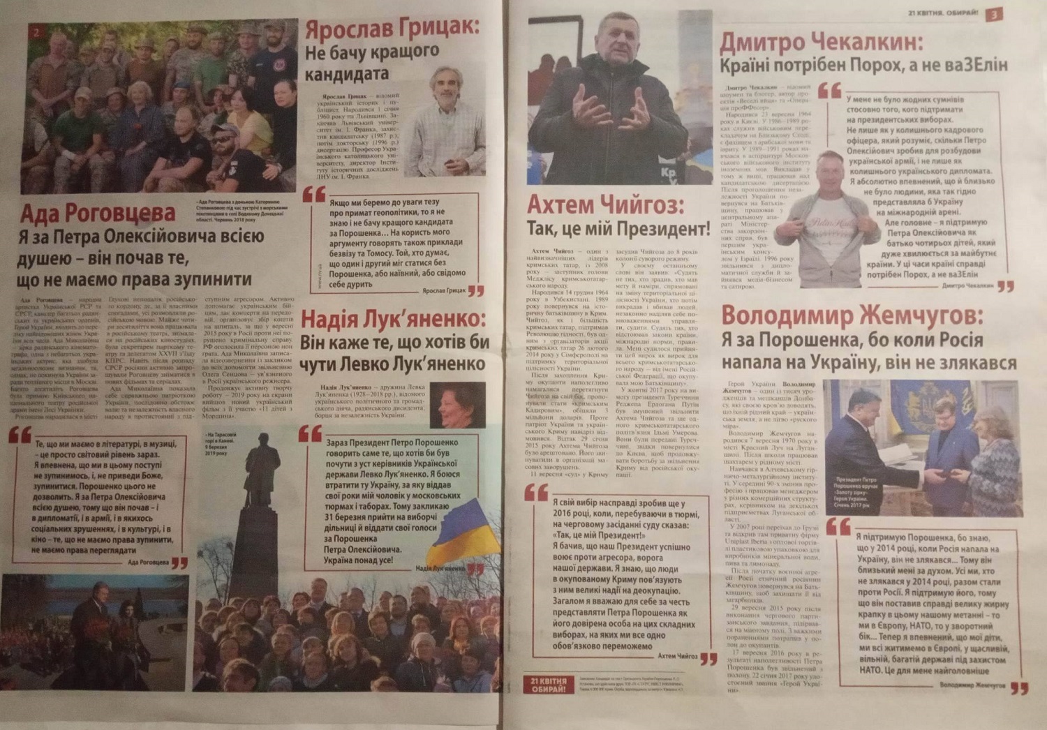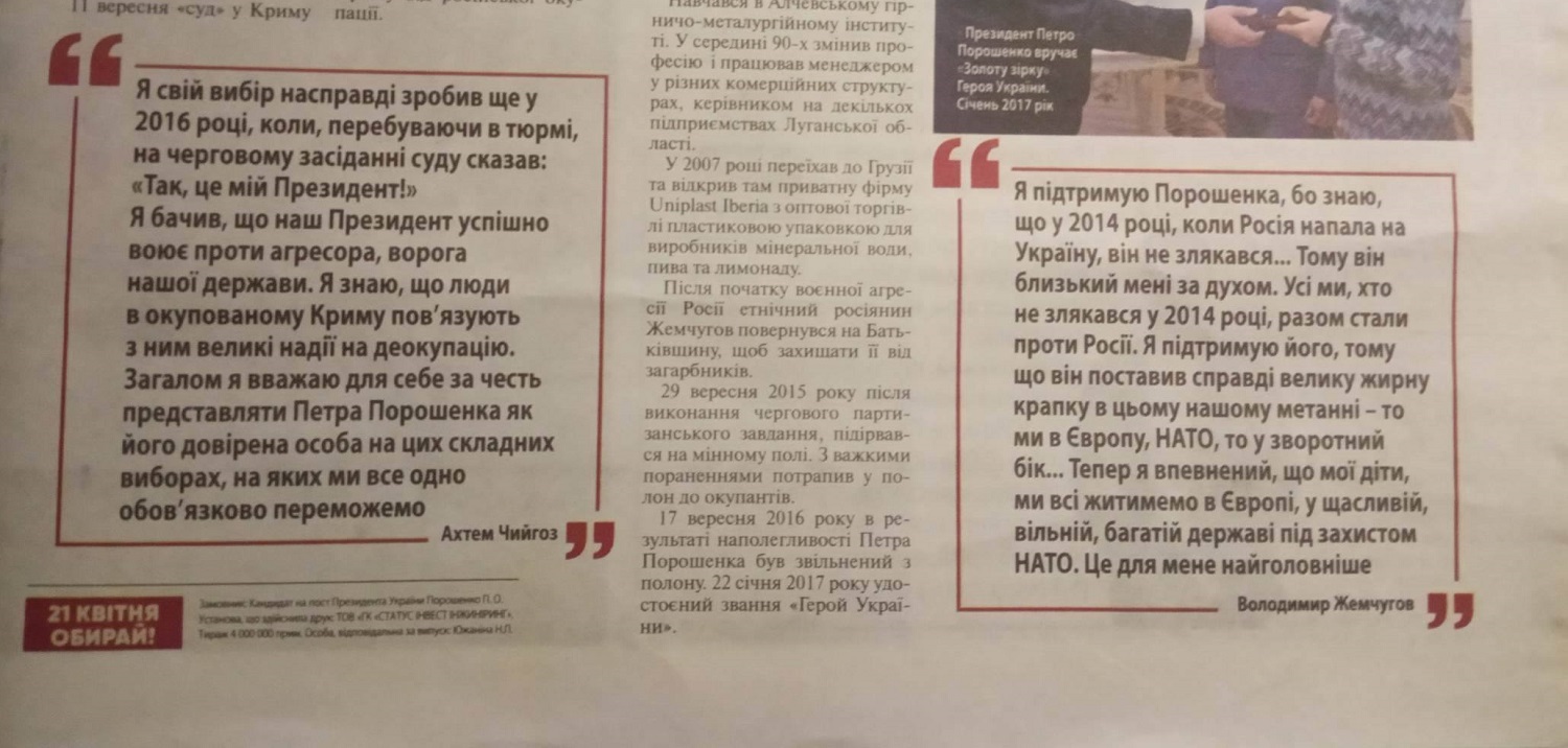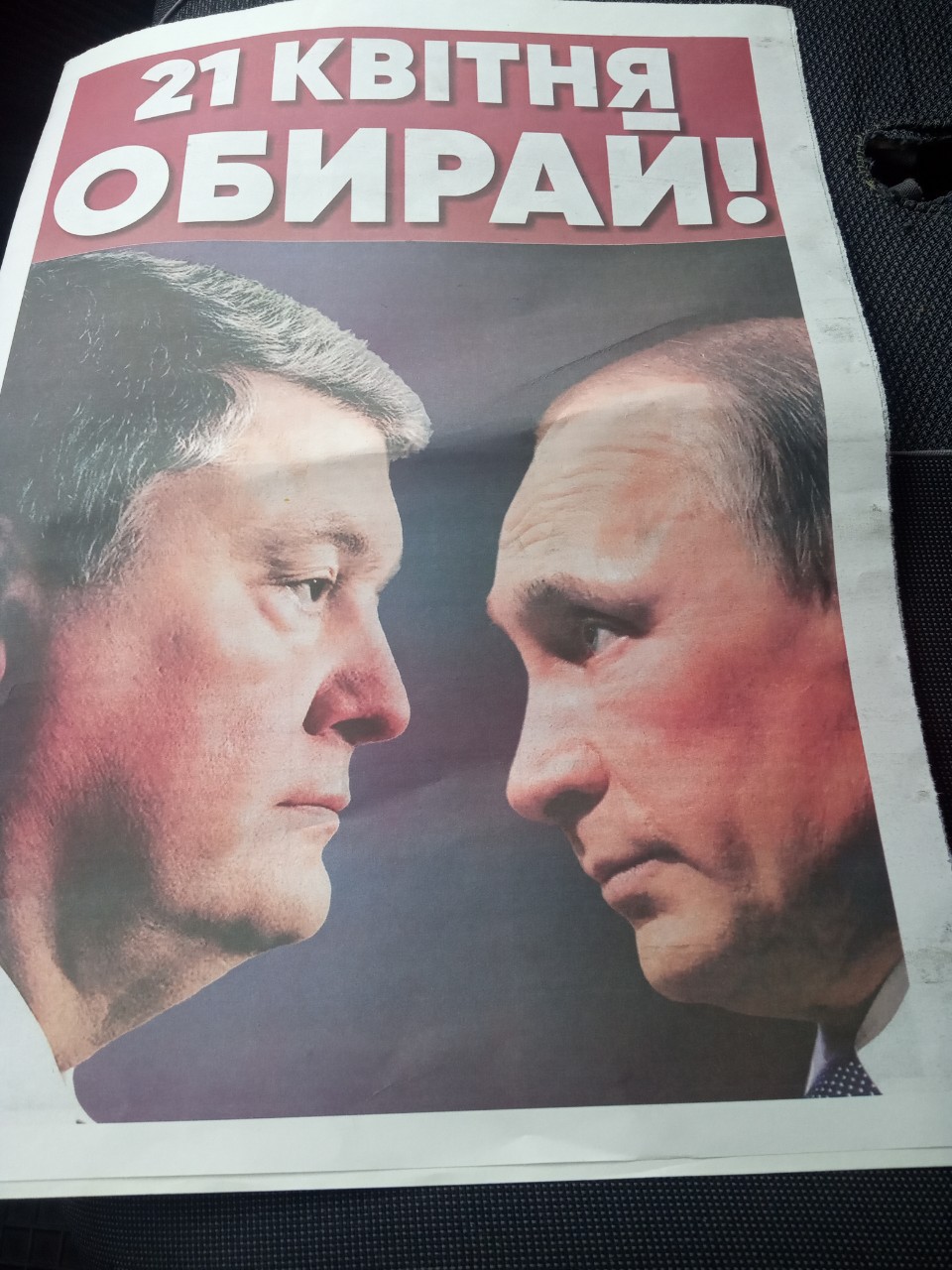 На першій шпальті газети, що містить всі вихідні дані, яких вимагає Закон України «Про вибори Президента України», розміщено напис «21 КВІТНЯ. ОБИРАЙ!» та зображення російського президента.
