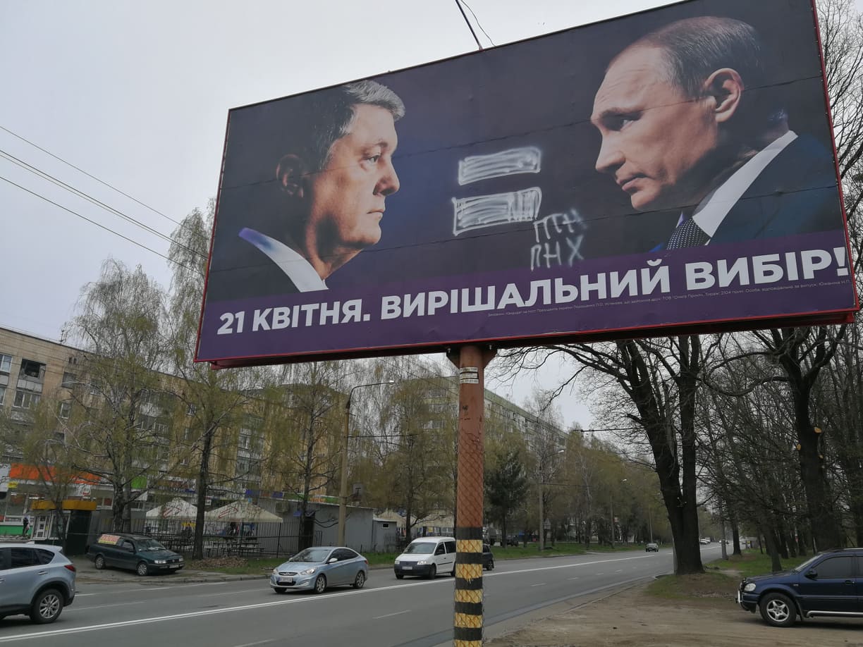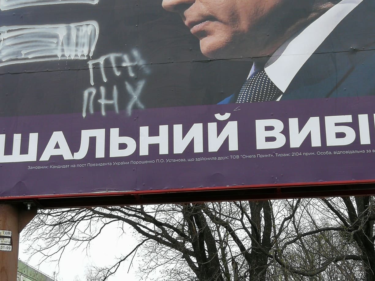 Зіпсовані білборди Петра Порошенка розміщені по вулиці Великотирнівській, поблизу зупинки громадського транспорту «Провулок Латишева», а також по вулиці Маршала Бірюзова, поблизу зупинки «Завод ЗБВ». На білборді міститься зображення Петра Порошенка та Володимира Путіна, а також напис «21 квітня! Вирішальний вибір». Замовником цієї агітаційної продукції вказано Петра Порошенка. В обох випадках білою фарбою поставлений знак рівності між зображеннями Порошенка та Путіна, а також зроблений напис «ПТН. ПНХ».