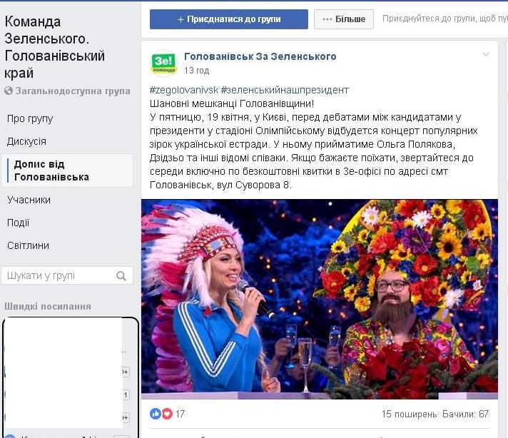 У Facebook-групі «Команда Зеленського. Голованівський край» 15 квітня був опублікований анонс видачі безкоштовних квитків на концерт «популярних зірок української естради» та запису на безкоштовну поїздку до Києва. У повідомленні йдеться, що виступ артистів відбудеться на НСК «Олімпійський» перед дебатами кандидатів у Президенти України. Отримати безкоштовні квитки та зареєструватися на безкоштовну поїздку пропонують в «Зе-офісі» за адресою смт. Голованівськ, вул. Суворова, 8.