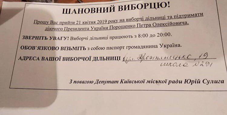 Виборцям Дарницького району від імені Депутата Київської міської ради Юрія Сулиги надсилають запрошення на другий тур вибрів, що відбудеться 21 квітня 2019 року. У повідомленнях повідомляють адресу та час роботи дільниці та закликають прийти і підтримати чинного Президента України Петра Порошенка.