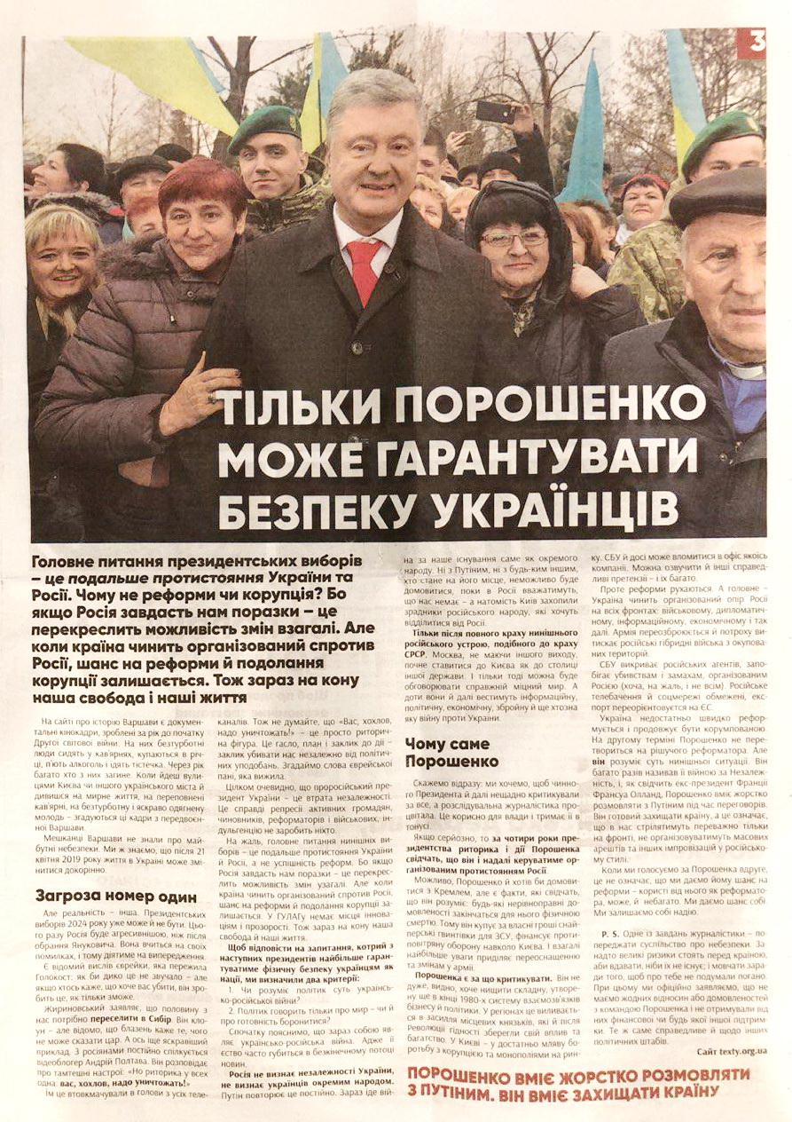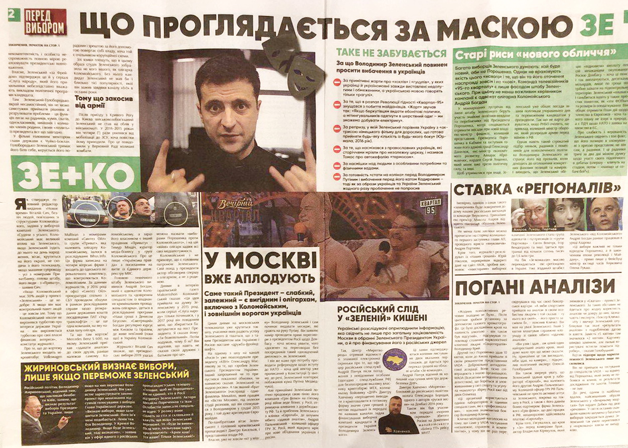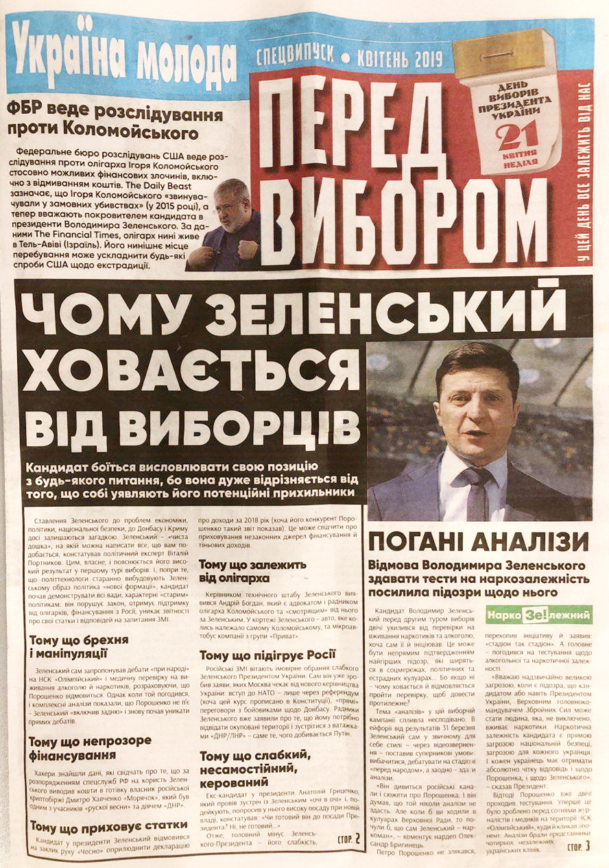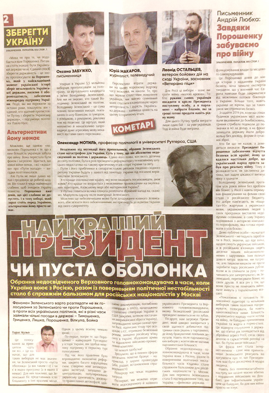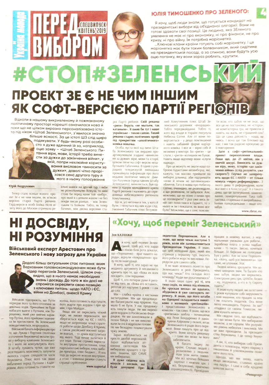 Натомість редакція «Газети по-українськи» публікує звернення письменників і державних діячів, які застерігають від голосування за Зеленського, а також передруковує розповідь підполковника Сергія Мацейка, який в інтерв’ю «Українській правді» стверджує, що Зеленський нібито ухилявся від мобілізації.